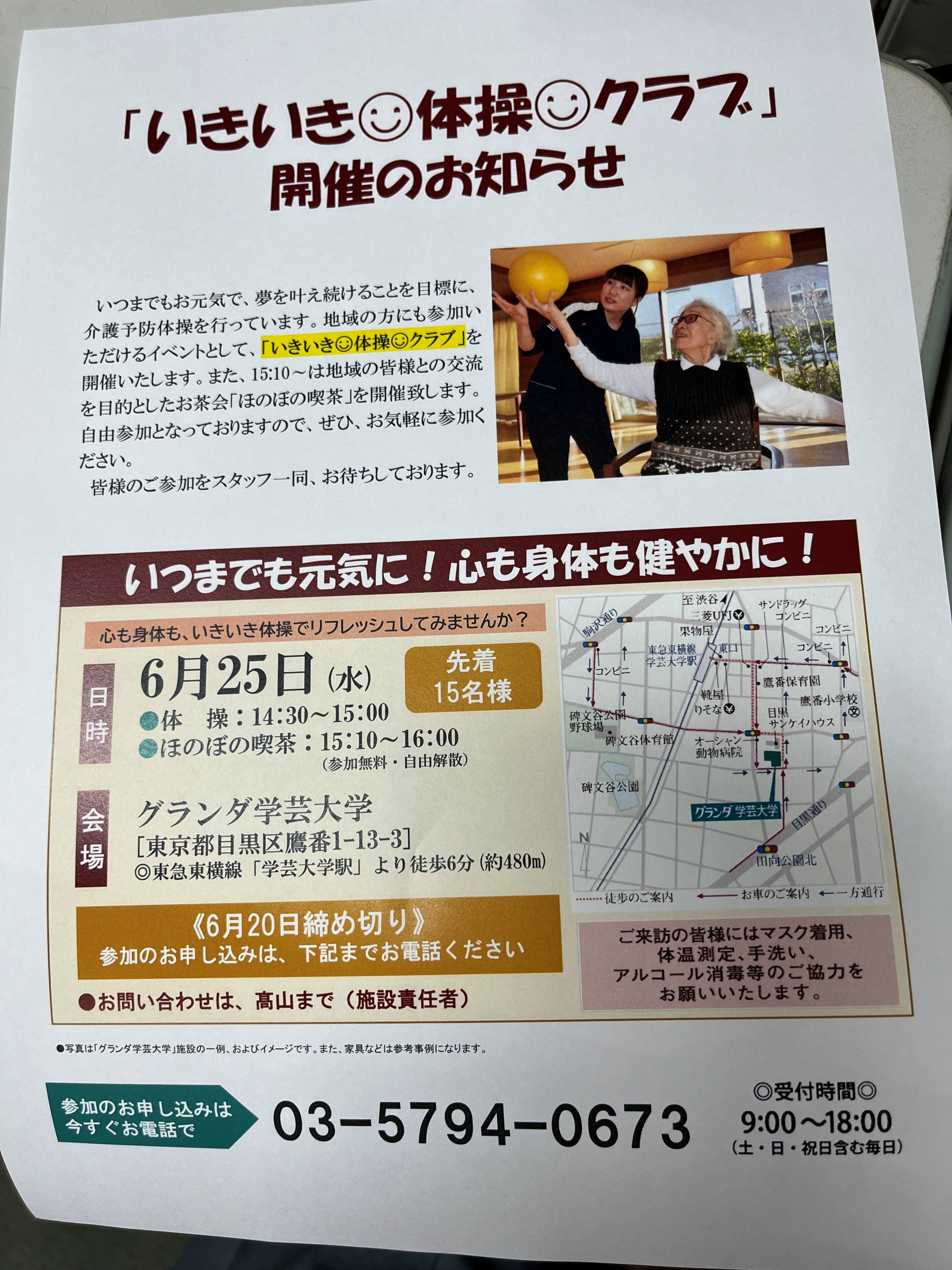 【目黒中央包括】いきいき体操クラブinグランダ学芸大学のお知らせ