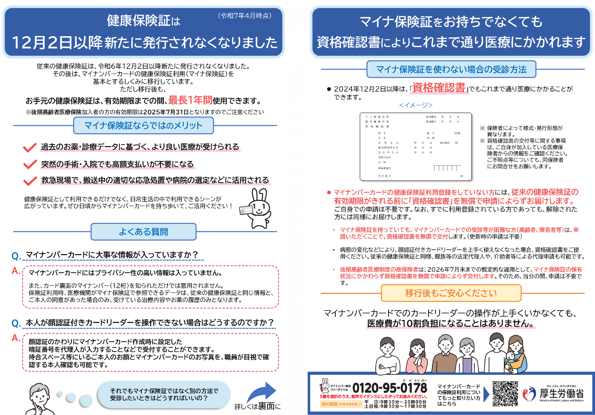 従来の健康保険証の有効期限は、最長で令和7年12月1日までです。医療機関・薬局の受付では、マイナ保険証をお持ちの方はマイナ保険証、マイナ保険証をお持ちでない方は資格確認書をご提示ください。