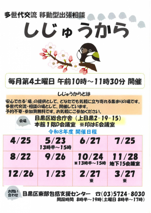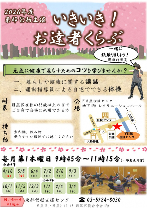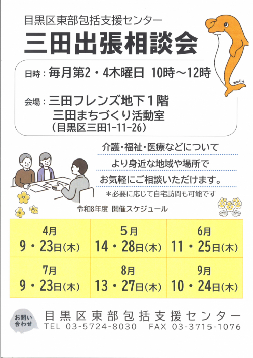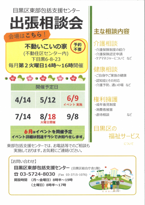 2026.04.28 【目黒区東部包括】給付管理のお知らせ お知らせ 2026.04.27 【目黒区東部包括】主任介護支援専門員実務者連絡会に参加しました! 活動報告 2026.04.27 【目黒区東部包括】認知症安心ガイドブックが新しくなりました お知らせ 2026.04.27 【目黒区東部包括】高齢者センター出張相談会を開催しました! 活動報告 2026.04.25 【目黒区東部包括】しじゅうから開催しました 活動報告 2026.04.24 【目黒区東部包括】東部地区ケアマネジャー幹事さんを募集しています! お知らせ 2026.04.24 【目黒区東部包括】不動出張相談会を開催しました 活動報告 2026.04.23 【目黒区東部包括】三田出張相談を開催しました! 活動報告 2026.04.21 【目黒区東部包括】あづまの会を開催しました 活動報告 2026.04.21 【目黒区東部包括】三田出張相談会を開催します! お知らせ 2026.04.17 【目黒区東部包括】包括事業部初任者研修に参加しました! 活動報告 2026.04.17 【目黒区東部包括】ふれあいの居場所開催しました 活動報告 2026.04.15 【目黒区東部包括】ふれあいの居場所開催します! お知らせ 2026.04.14 【目黒区東部包括】東京都介護支援専門員向け研修に参加しました! 活動報告 2026.04.10 【目黒区東部包括】お達者くらぶ開催しました! 活動報告 1 2 3 … 52