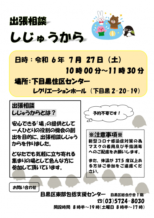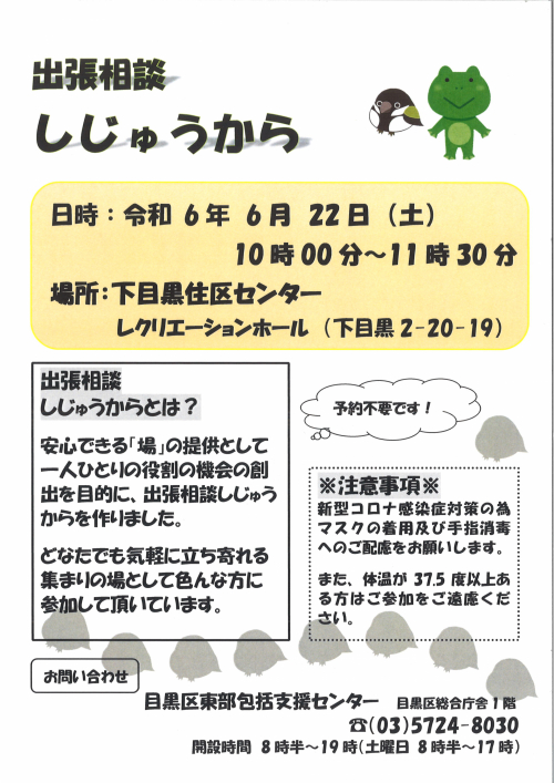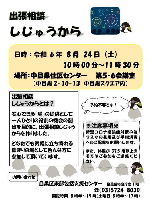2024.12.21 【目黒東部包括】出張相談「しじゅうから」を開催しました 活動報告 #しじゅうから #出張相談会 #目黒区 2024.11.30 【目黒東部包括】出張相談「しじゅうから」開催しました。 活動報告 #しじゅうから #出張相談会 #目黒区 2024.11.26 高齢者センター出張相談会を開催しました 活動報告 #目黒区 #高齢者センター #出張相談会 2024.11.20 【目黒東部包括】高齢者センターにて出張相談会を開催いたします! お知らせ #出張相談会 #高齢者センター出張相談会 2024.10.24 【目黒東部包括】出張相談『しじゅうから』を開催いたします お知らせ #しじゅうから #出張相談会 #目黒区 #下目黒住区センター 2024.08.24 【目黒東部包括】出張相談「しじゅうから」開催しました 活動報告 #出張相談会 #しじゅうから 2024.08.23 【目黒東部包括】高齢者センター出張相談会を開催しました! 活動報告 #目黒区高齢者センター #出張相談会 2024.08.19 【目黒東部包括】しじゅうから開催します。 お知らせ #出張相談会 #しじゅうから #目黒区 2024.07.23 【目黒東部包括】しじゅうから開催します お知らせ #しじゅうから #出張相談会 2024.07.02 【目黒区東部包括】不動出張相談会を開催します お知らせ #出張相談会 #不動老人いこいの家 2024.06.22 【目黒区東部包括】高齢者センター出張相談会開催しました 活動報告 #目黒区高齢者センター #出張相談会 2024.06.20 【目黒東部包括】本日高齢者センター出張相談会を開催します! お知らせ #出張相談会 #高齢者センター #目黒区 2024.06.15 【目黒東部包括】しじゅうから 開催します! お知らせ #出張相談会 #しじゅうから 2024.06.15 【目黒東部包括】三田出張相談会を開催します お知らせ #出張相談会 #三田 2024.06.07 【目黒区東部包括】不動出張相談会を開催します お知らせ #出張相談会 #血管年齢測定 1 2 3