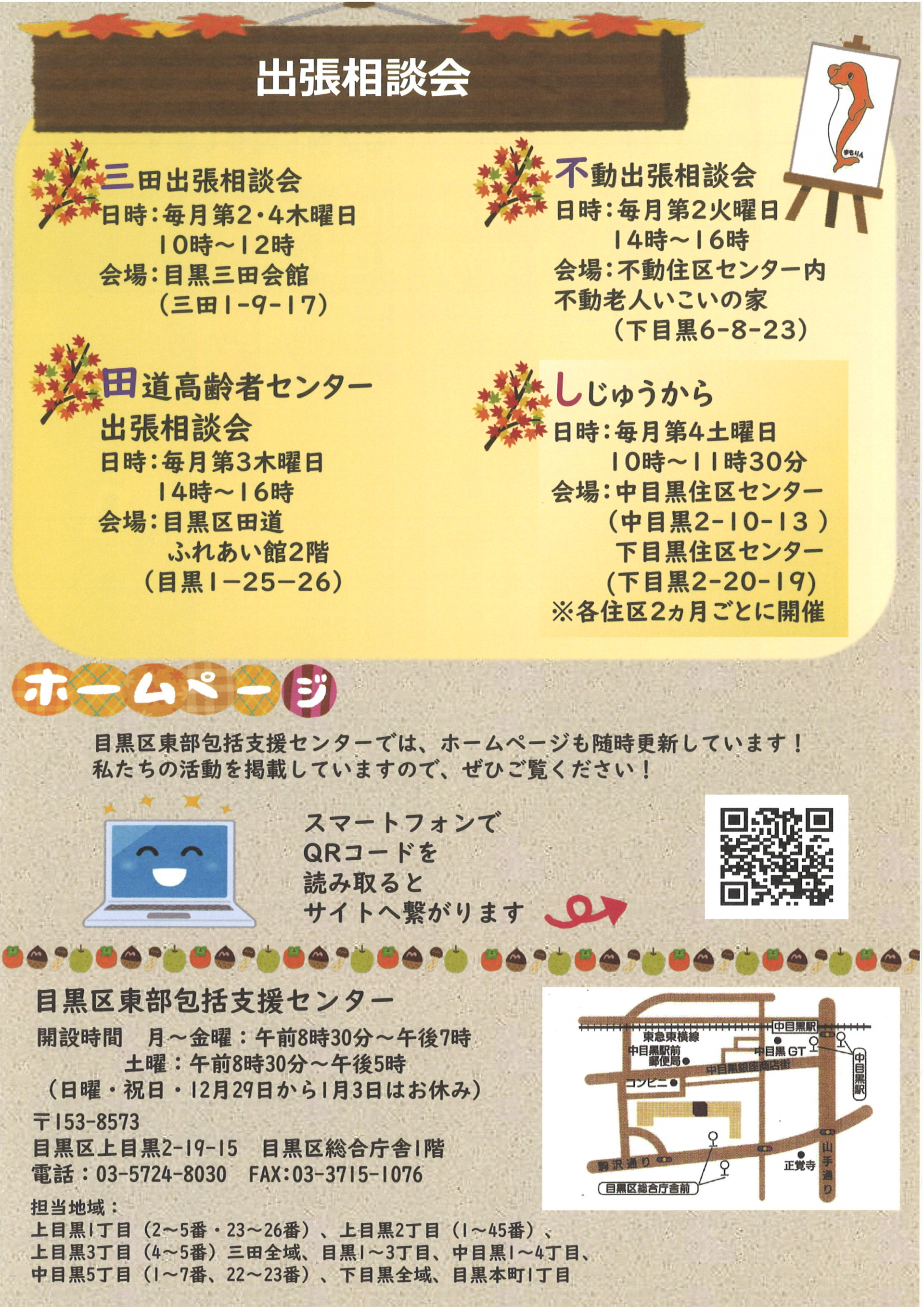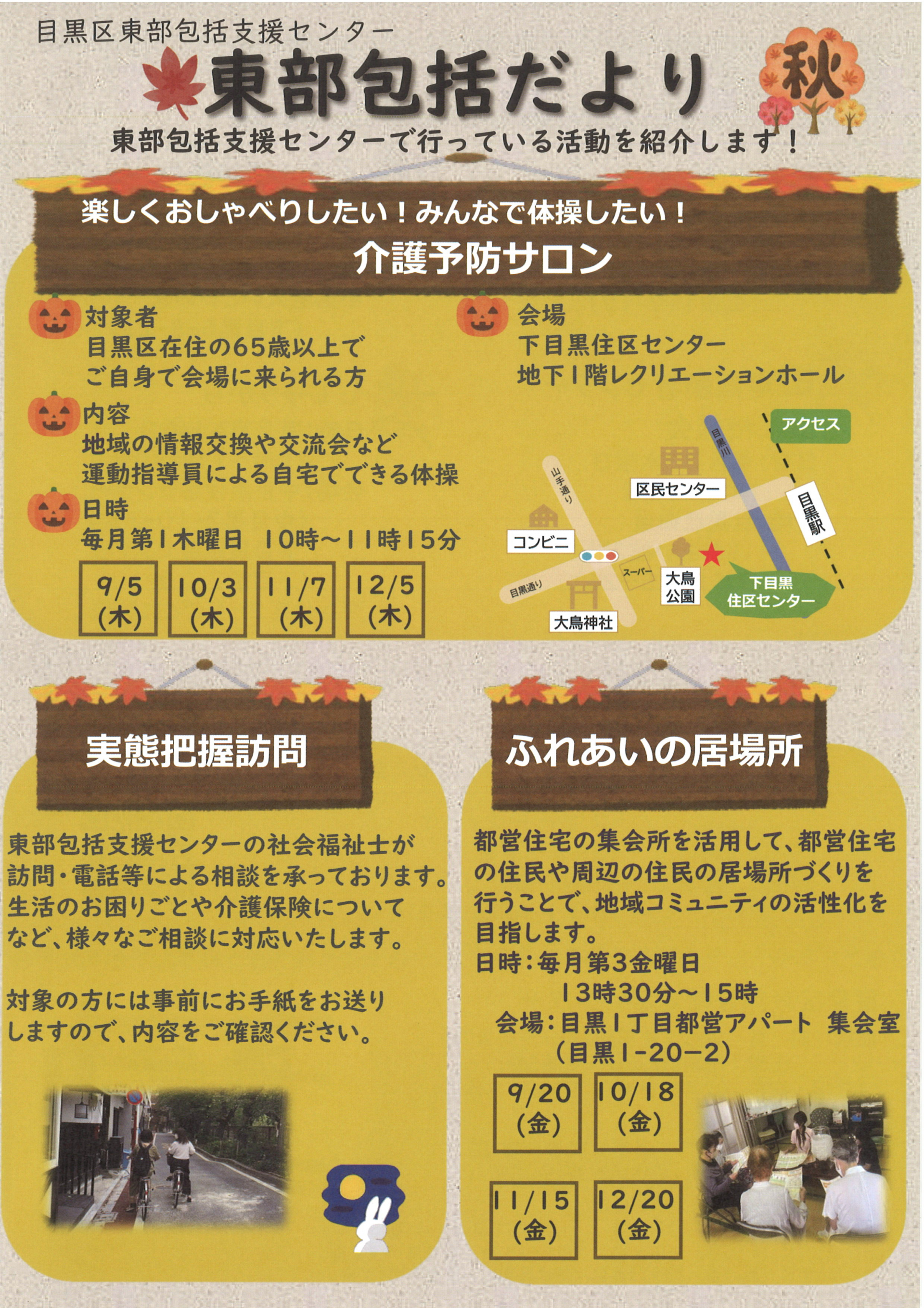 2024.08.30 活動報告(IN) 【目黒東部包括】目黒東部ほうかつだより 秋号 Tweet シェアする 東部包括だより 秋号を作成しました。 出張相談会やサロンのお知らせもありますので、是非ご覧ください! 窓口や出張相談等で配布を行っています。 主任介護支援専門員:N.K. #東部包括だより 前の記事 2024.09.03 活動報告(IN) 【目黒東部包括】9/10に不動出張相談会を行います! 次の記事 2024.08.30 活動報告(IN) 【目黒東部包括】かかし作成に参加してきました! 一覧へ戻る