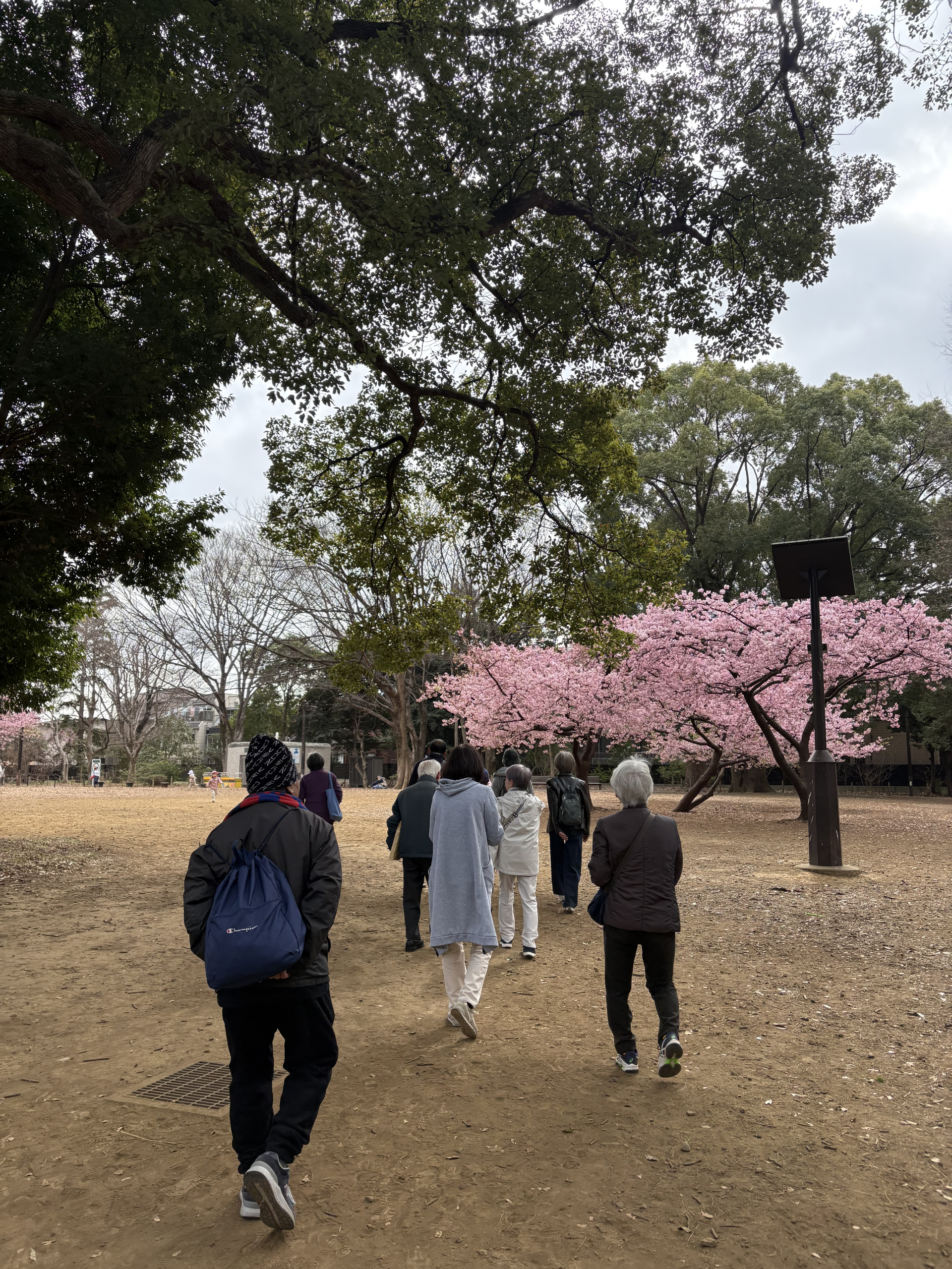 今回は林試の森公園周辺をウォーキングし、満開の河津桜の前で集合写真も撮りました**