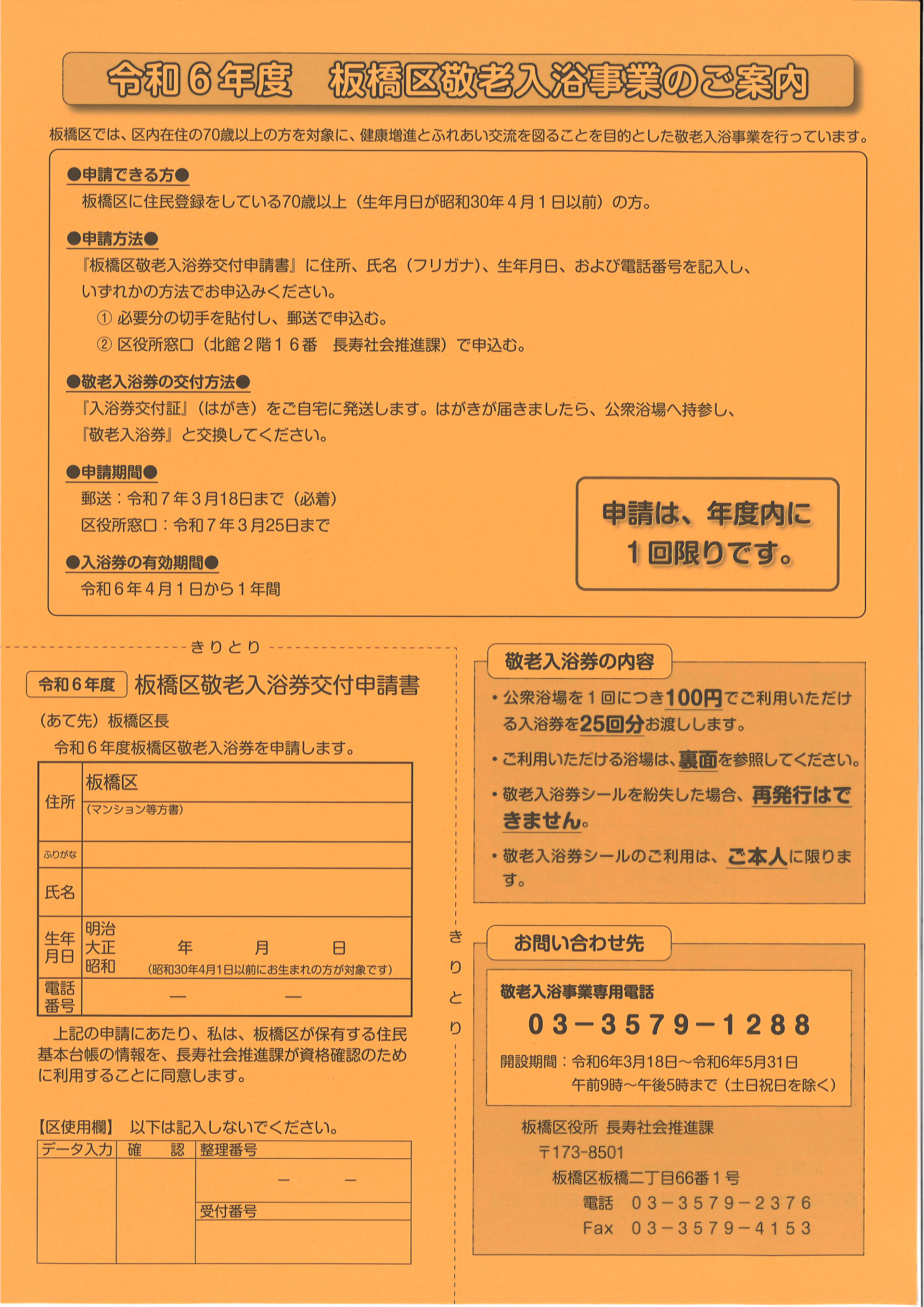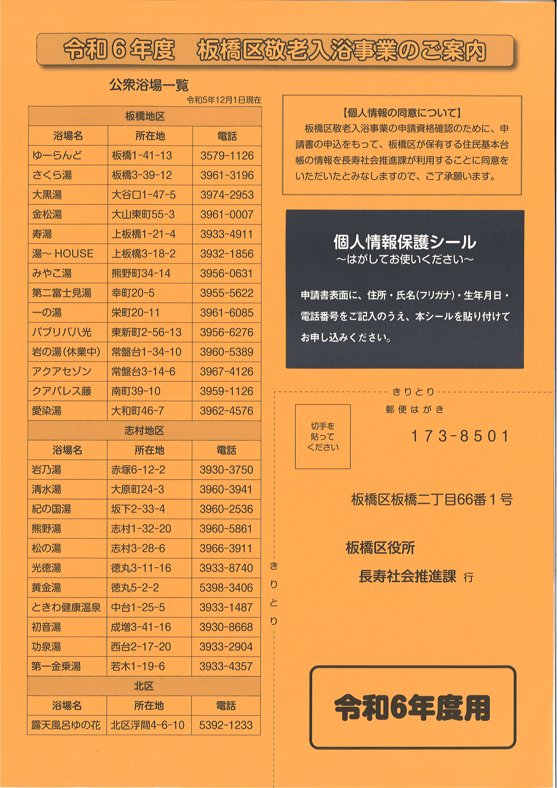 2024.04.14 お知らせ 【みどりの苑居宅】令和6年度の敬老入浴事業のご案内 Tweet シェアする 令和6年度 板橋区敬老入浴事業のご案内 今年度の敬老入浴事業のご案内が出ていましたので、お知らせいたします。 お近くの敬老館、おとしより相談センター等にて入手できるようです。 前の記事 2024.04.16 お知らせ 【みどりの苑居宅】お買い物ツアーを取り入れている通所リハビリセンター 次の記事 2024.04.13 お知らせ 【みどりの苑居宅】いきいき通信より耳より情報♪ 一覧へ戻る