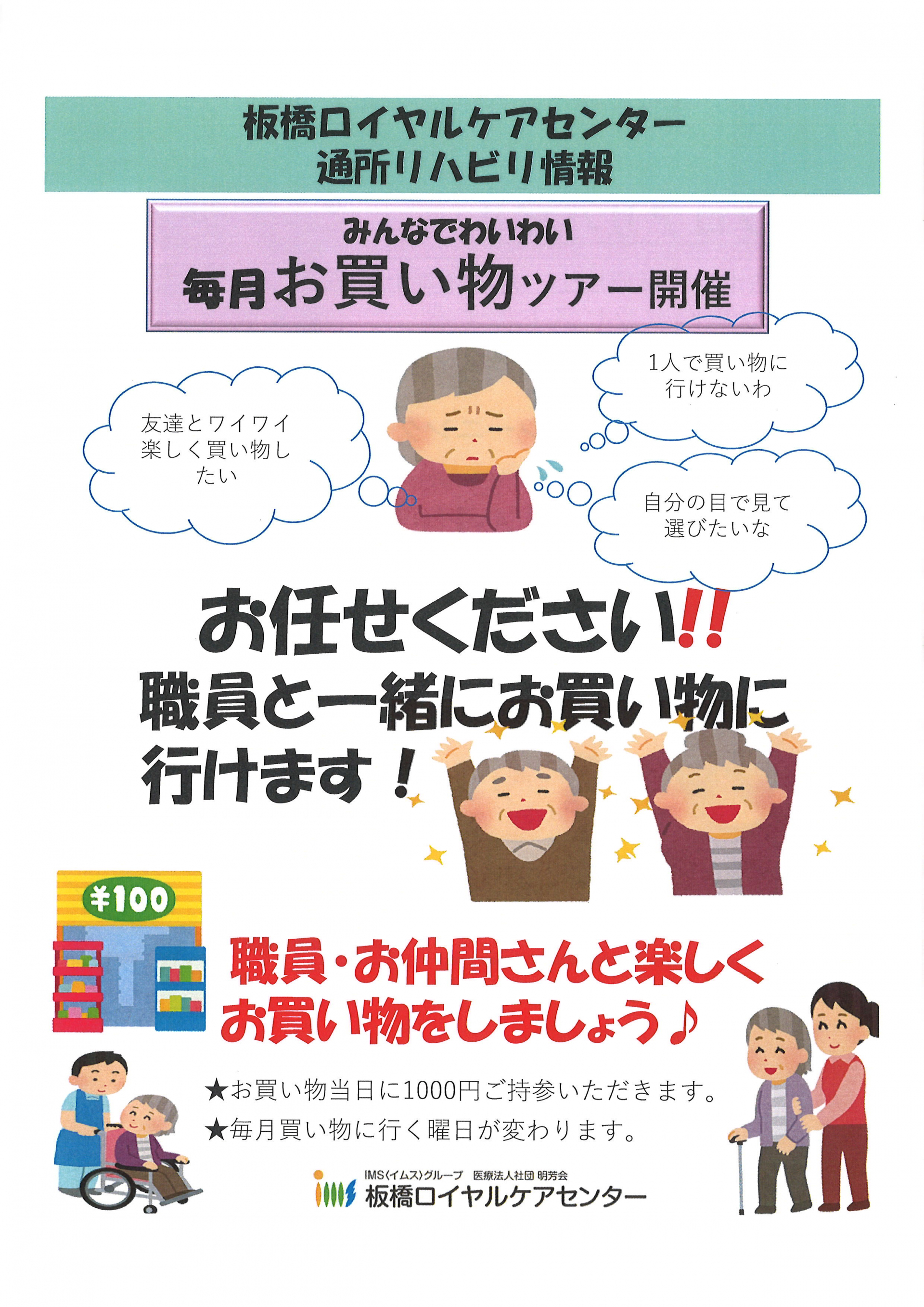 2024.04.16 お知らせ 【みどりの苑居宅】お買い物ツアーを取り入れている通所リハビリセンター Tweet シェアする 一人で買物に行けない。自分の目で見て品物をえらびたい。友達とワイワイ楽しくお買い物をしたい。このような方デイの職員さんと一緒にお買い物に行くことができます。このよう通所リハビリもあり選択のひとつに提案したいと思いました。 SA 前の記事 2024.04.18 お知らせ 【みどりの苑居宅】車いす無料レンタル 次の記事 2024.04.14 お知らせ 【みどりの苑居宅】令和6年度の敬老入浴事業のご案内 一覧へ戻る