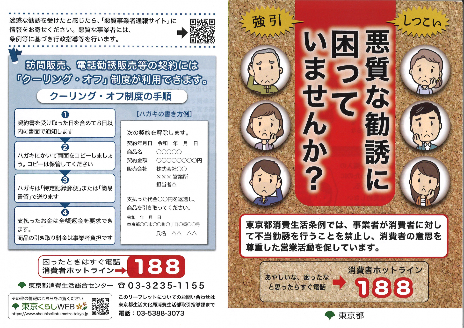 2024.04.19 お知らせ 【みどりの苑居宅】消費者ホットライン Tweet シェアする あやしいな、困ったなと思ったらすぐ電話! 188 です。 188は東京都の消費者ホットラインの連絡先です。 強引な勧誘、しつこい勧誘に困っていたら、一人で悩まず 118に電話して相談してください。 前の記事 2024.04.22 お知らせ 【みどりの苑居宅】認知症の本人が主役、本人ミーティングに参加しました。 次の記事 2024.04.18 お知らせ 【みどりの苑居宅】車いす無料レンタル 一覧へ戻る
