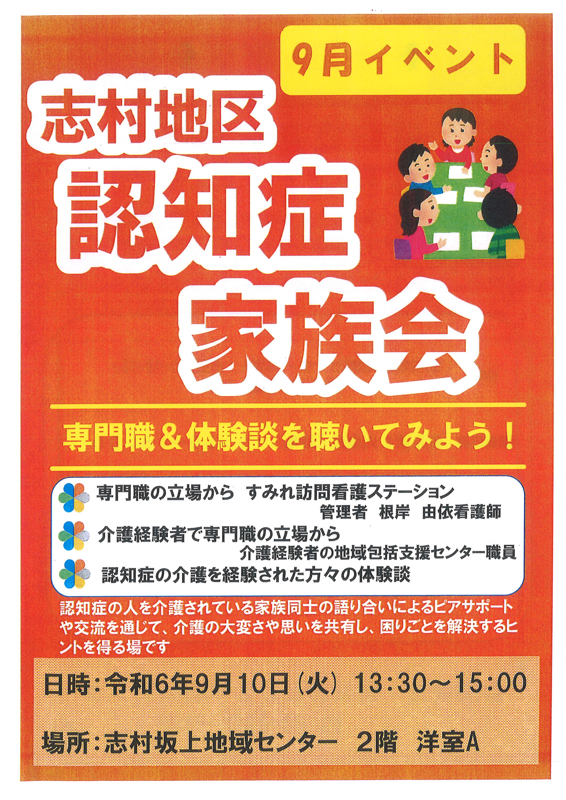 2024.08.08 活動報告 認知症家族会 Tweet シェアする 先日清水おとしより相談センターに行った際に、認知症家族会があるのでぜひお越しくださいとお声かけされました。本人ミーティングは毎日行われてましたが家族会は久しぶりとの事です。私も対象になるようなご家族がいたらお声かけしようと思います。 O・M 前の記事 2024.08.16 活動報告 東ラウンジカフェ 次の記事 2024.07.26 活動報告 【みどりの苑居宅】本人ミーテング参加 一覧へ戻る