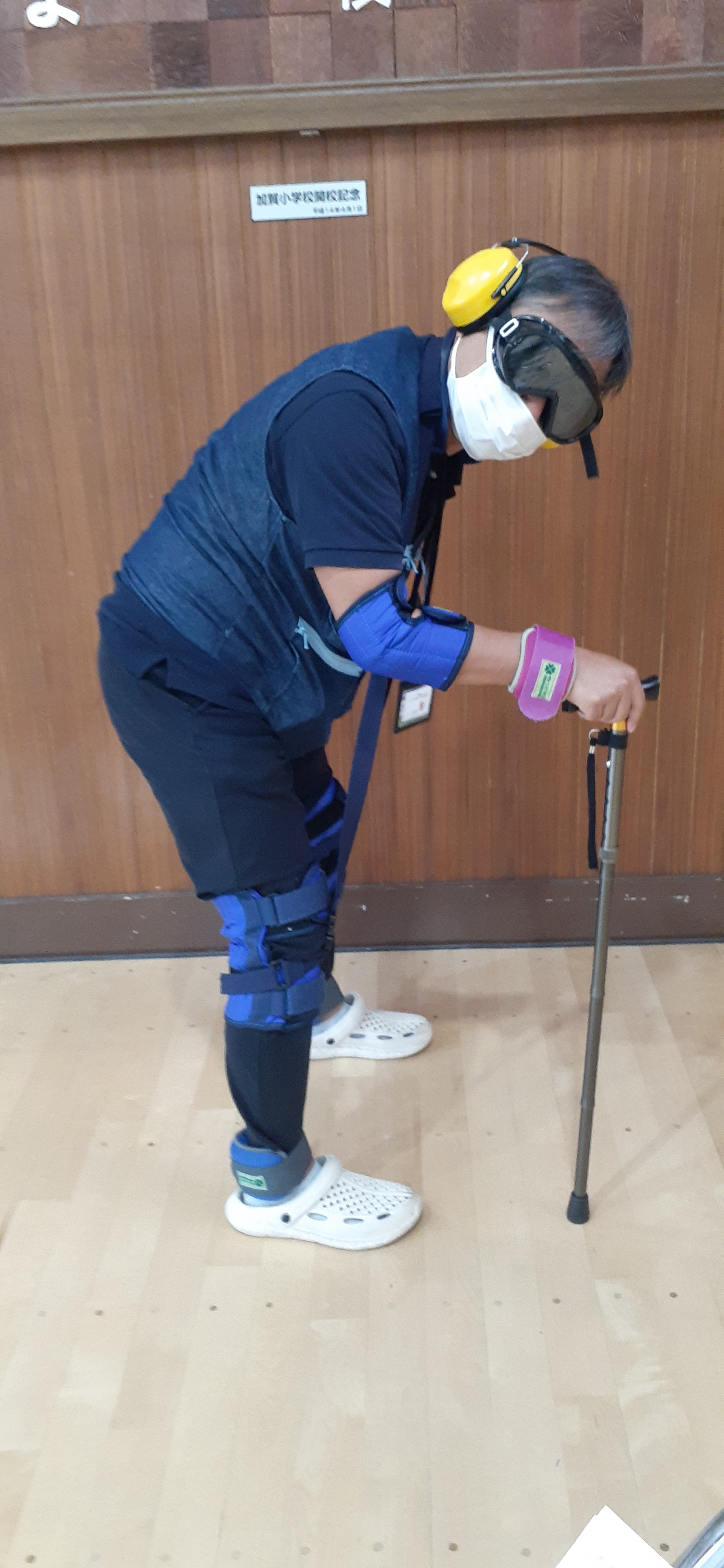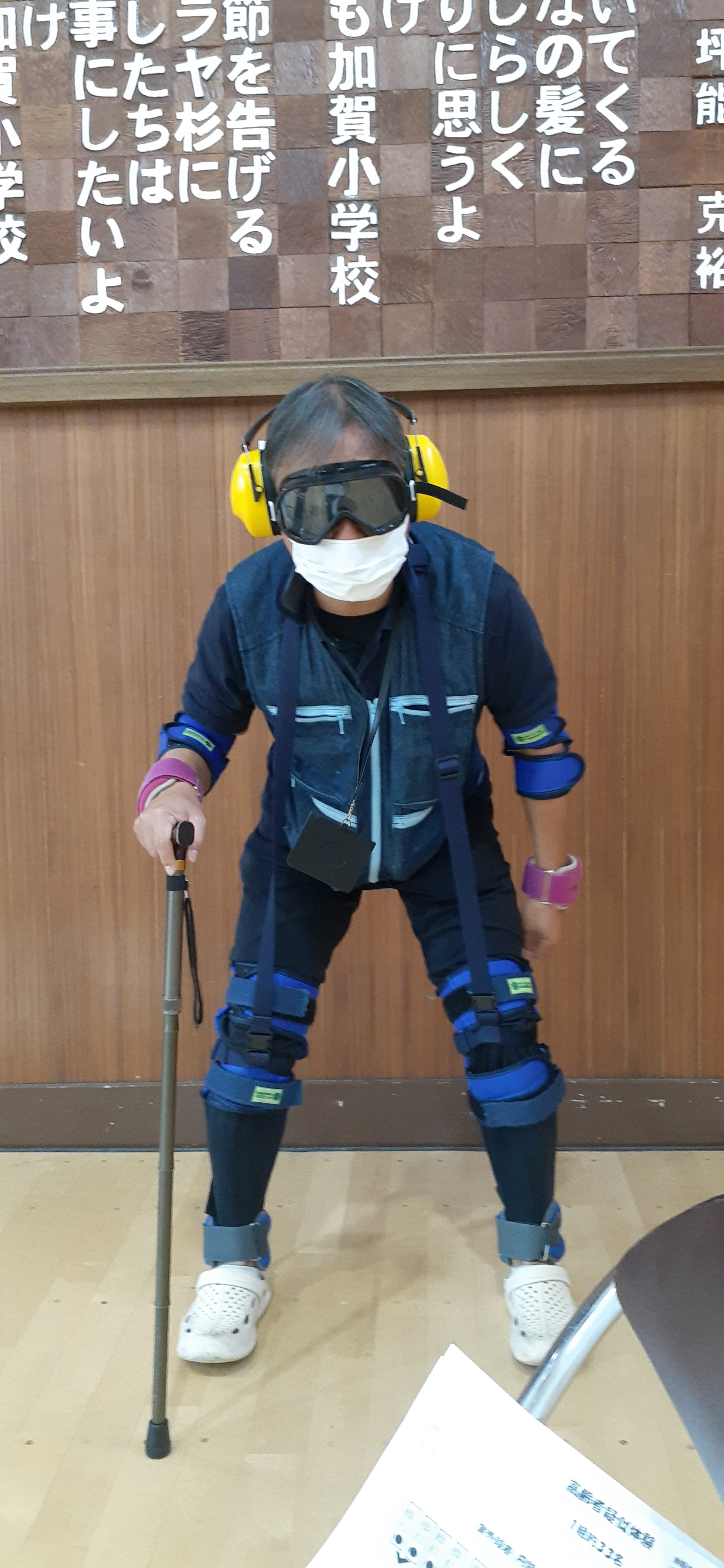 高齢者疑似体験では肘・膝にサポーター装着これでかなり可動制限がかかります。手首足首に重り、ベストを着てそこにも重りを入れます。ゴーグルを着けて視界を狭めます。耳にはヘッドホン。頸部と膝をベルトで繋ぐと前傾で円背になります。これでかなり動きが制限され、小学生の皆さんにはこれで歩行してもらい階段を上り下りしてもらいました。最初は「こんなの意外と大丈夫だ!」と言っていましたが戻って装備を外すと「(外して)あーよかった!」と、それだけ身体に負荷がかかっていたのです。私自身にとってもたいへん貴重な時間が過ごせました。OM