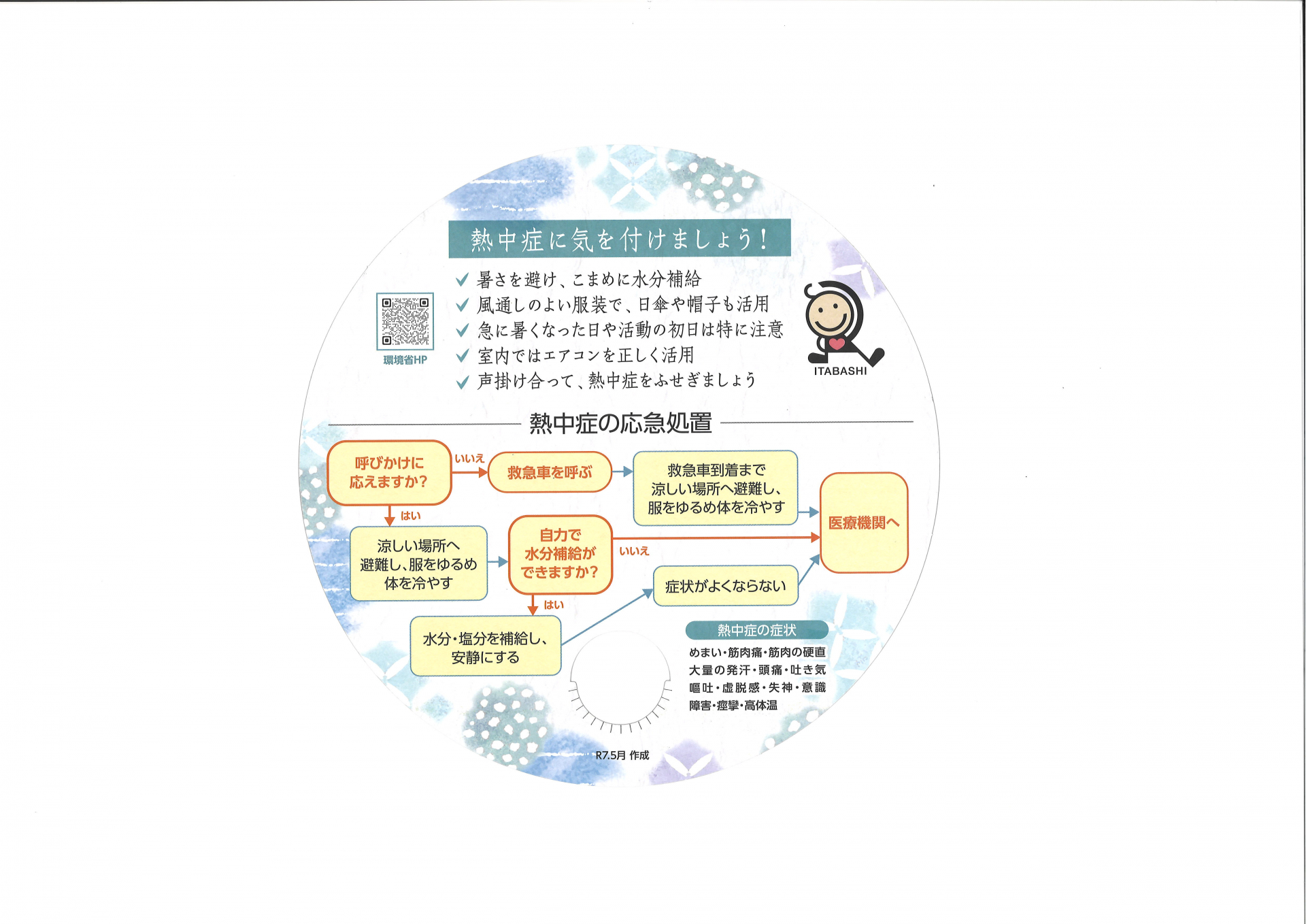 2025.07.04 活動報告 【みどりの苑居宅】熱中症対策 団扇 Tweet シェアする 本日、前野おとしより相談センターに行った際に熱中症対策予防を励行する団扇がありましたので1ついただいてきました。 わかりやすい表示で熱中症になった際の応急処置が記されています。事務所に1つ置くと役にたつと思いました。 OM 前の記事 2025.07.07 活動報告 【みどりの苑居宅】令和7年7月7日 次の記事 2025.07.03 活動報告 【みどりの苑居宅】東カフェ 一覧へ戻る