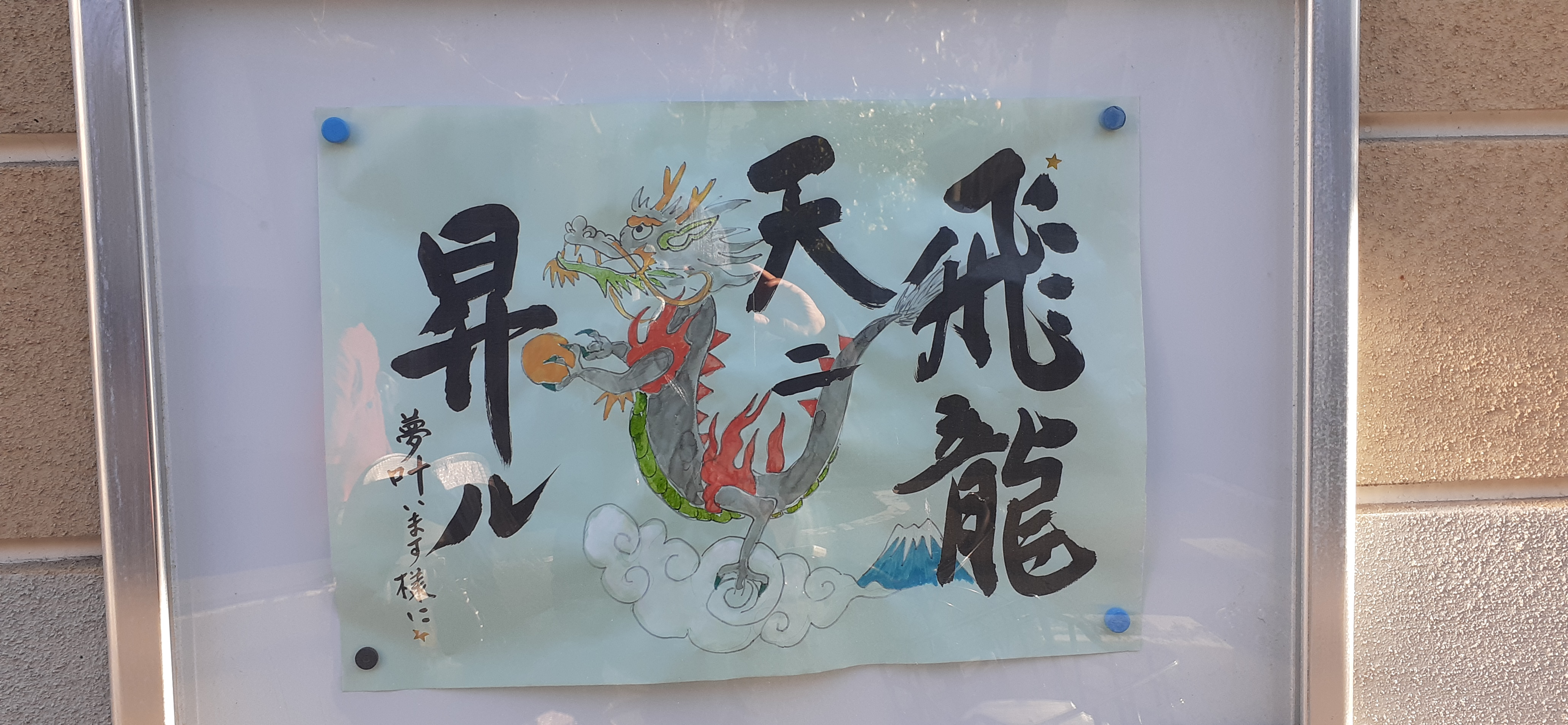 2024.01.09 活動報告 【みどりの苑居宅】飛龍 Tweet シェアする 今朝通勤途中、みどりの苑の近隣のお寺に「飛龍 天に 昇る」という絵が飾ってありました。おとしより保健福祉センターの前にあるお寺でいつも定期的に壁に様々なお言葉が掲示してあります。お正月から様々な事が起こっているのでここから飛龍の如く駆け上がりたいですね。 前の記事 2024.01.09 活動報告 【みどりの苑居宅】運転免許証 次の記事 2024.01.05 活動報告 【みどりの苑居宅】新年(続き) 一覧へ戻る