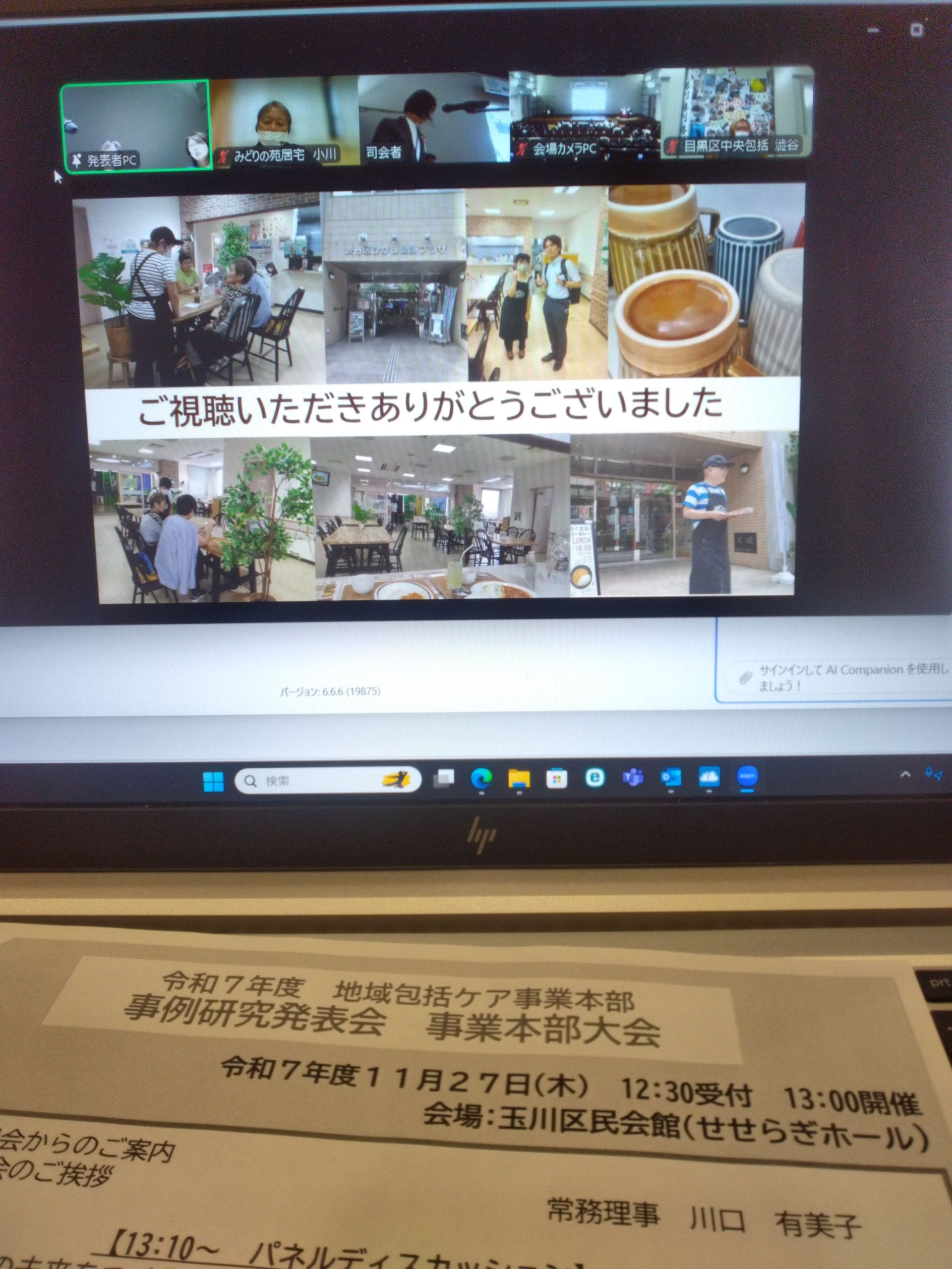 2025.11.27 活動報告 事例研究発表会 Tweet シェアする 本日13時~玉川区民会館にて地域包括ケア事業本部の事例研究発表会が行われました。都合により現地ではなく自事業所にてZOOMにて参加させていただきました。業務も兼ねて視聴しておりましたので全てを見れたわけではありませんが皆どれも素晴らしい題材と構成で感銘いたしました。 入賞された・荒川地域包括支援センターの皆様、目黒区中央包括支援センターの皆様、居宅委員会の皆様、中村かしわ地域包括支援センターの皆様おめでとうございます。 OM 前の記事 2025.11.28 活動報告 【みどりの苑居宅】ケアマネ更新研修1日目終了しました 次の記事 2025.11.27 活動報告 【みどりの苑居宅】区民公開講座 一覧へ戻る