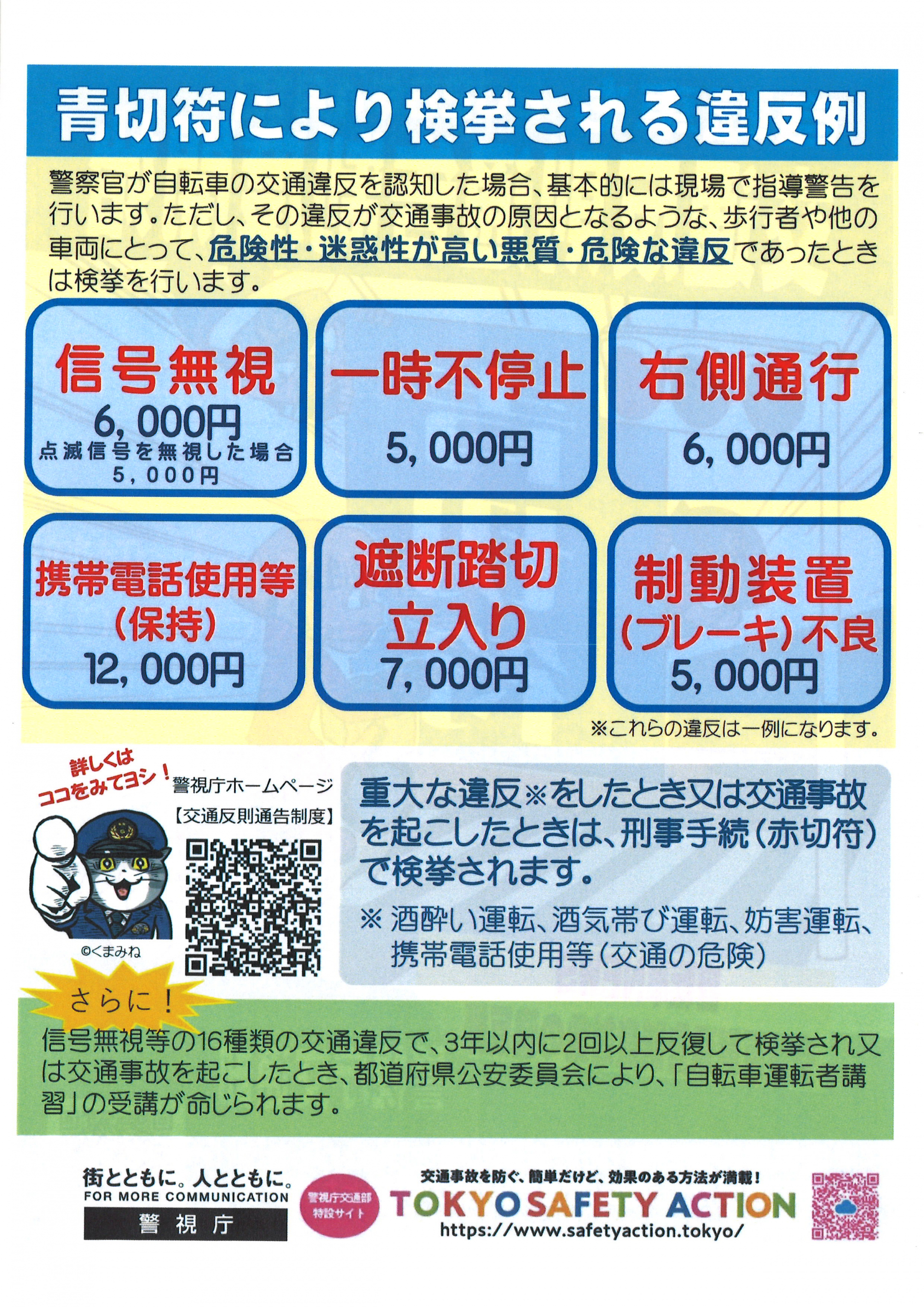 自転車の交通違反を警察が認知し、危険性・迷惑性が高い悪質・危険な違反であったときは青切符により検挙されます。