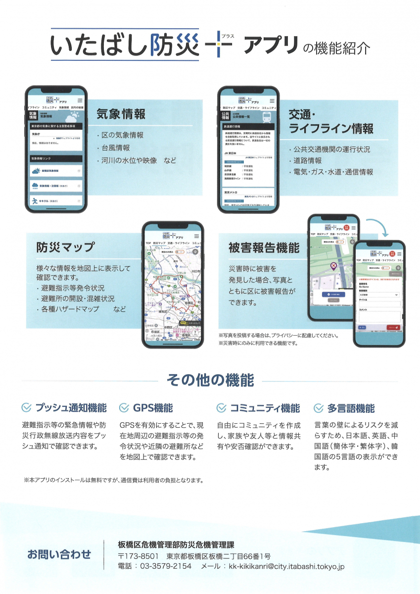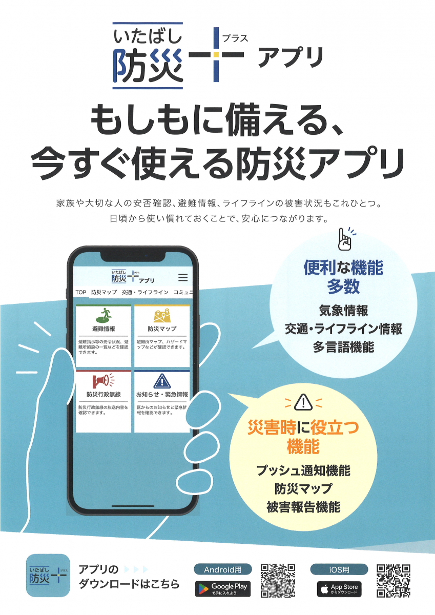 2026.04.23 活動報告 【みどりの苑居宅】いたばし防災アプリ Tweet シェアする 防災の準備のひとつにスマホからアプリを取り込んで災害時に役にたつ機能という物を見つけました。気象情報・交通・ライフライン情報・防災マップ・被害報告機能等を知らせる事ができるそうです。最近も地震・津波・山火事等が起きています、色々なメースに備えておく必要があると思いますのでお役立ていただければ幸いです。OM 前の記事 2026.04.23 活動報告 【みどりの苑居宅】ひきこもり相談 次の記事 2026.04.23 活動報告 【みどりの苑居宅】悪質商法に注意 一覧へ戻る