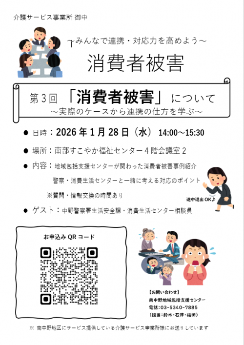 2026.01.08 【南中野包括】専門職向け講座のご案内『消費者被害』~実際のケースから連携のしかたを学ぶ~ お知らせ 2026.01.07 【南中野包括】1/30 こころもからだもリフレッシュ! 活動報告 2026.01.06 【南中野包括】1/16アシスト中野 事業説明会 お知らせ 2026.01.05 【南中野包括】中野区賀詞交歓会 地域包括支援センター 2025.12.28 【南中野包括】地域福祉の担い手シリーズ~民生委員会長のインタビューから~ 地域包括支援センター 2025.12.27 【南中野包括】年末年始の担当医療機関 お知らせ 2025.12.26 【南中野包括】民生児童委員協議会に参加しました 活動報告 2025.12.25 【南中野包括】メリークリスマス! 地域包括支援センター 2025.12.24 【南中野包括】しんやまの家『カラオケスタジオ』に参加してきました🎤 活動報告 2025.12.23 【南中野包括】災害事業に向けて炊き出し練習 地域包括支援センター 2025.12.22 【南中野包括】クリスマス会で多世代交流 活動報告(IN) 2025.12.19 【南中野包括】お茶処 こうぶんかん 活動報告 2025.12.18 【南中野包括】しんやまの家にて「いつ相談すればいいの?」をテーマにお話してきました 活動報告 2025.12.17 【南中野包括】夜の中野区役所で・・・・ 地域包括支援センター 2025.12.16 【南中野包括】商店街にはクリスマスツリー~コスモ会館「いつものところ」から~ 地域包括支援センター 1 2 3 … 36