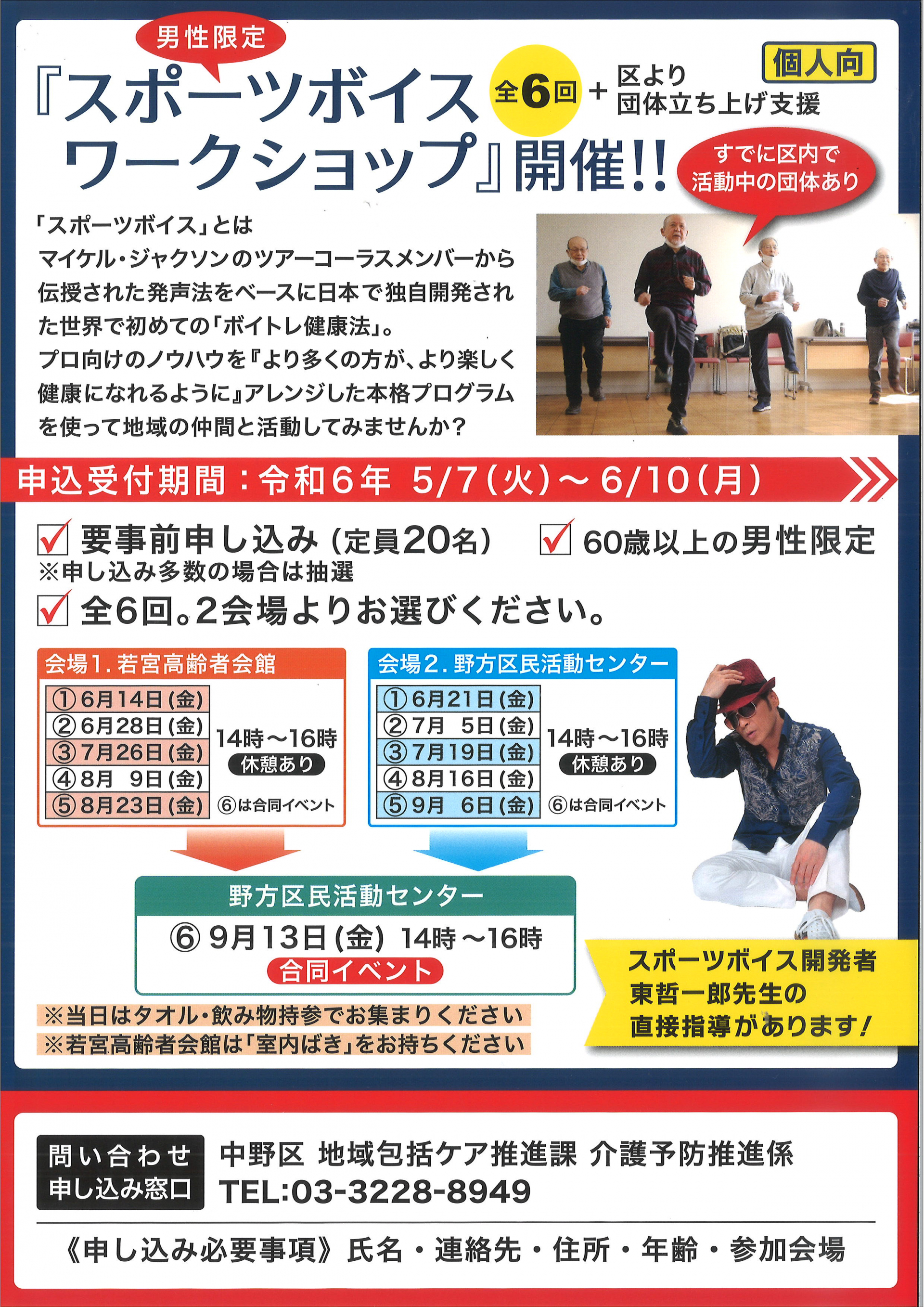 ボイストレーニングを活用した健康法で、「男のボイス」という団体活動の輪を拡げよう、というものです。