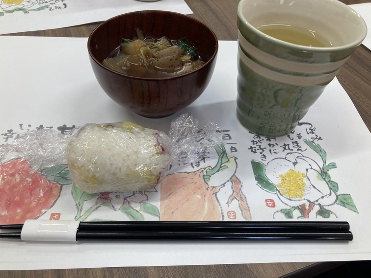 美味しい手作りの具沢山のお味噌汁とおにぎり。