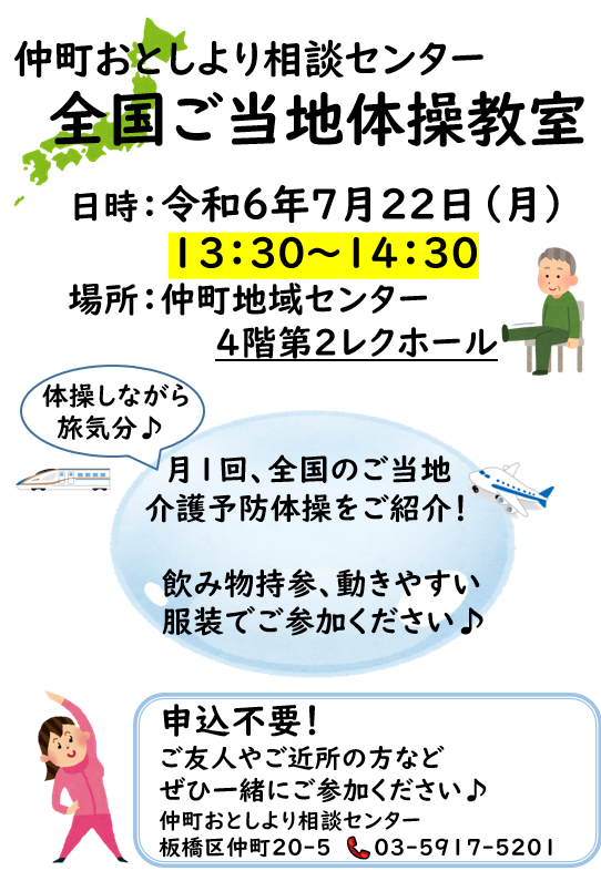 2024.07.01 活動報告 【仲町包括】7月のご当地体操教室のご案内 Tweet シェアする 7月ですね! 仲町おとしより相談センターでは、今月も『全国ご当地体操教室』を開催します♪ 暑い日が続きます。無理のない範囲でご参加ください! 前の記事 2024.07.01 活動報告 【仲町包括】支え合い会議仲町地域 次の記事 2024.06.29 活動報告 【仲町包括】今月もご当地体操教室を開催しました! 一覧へ戻る