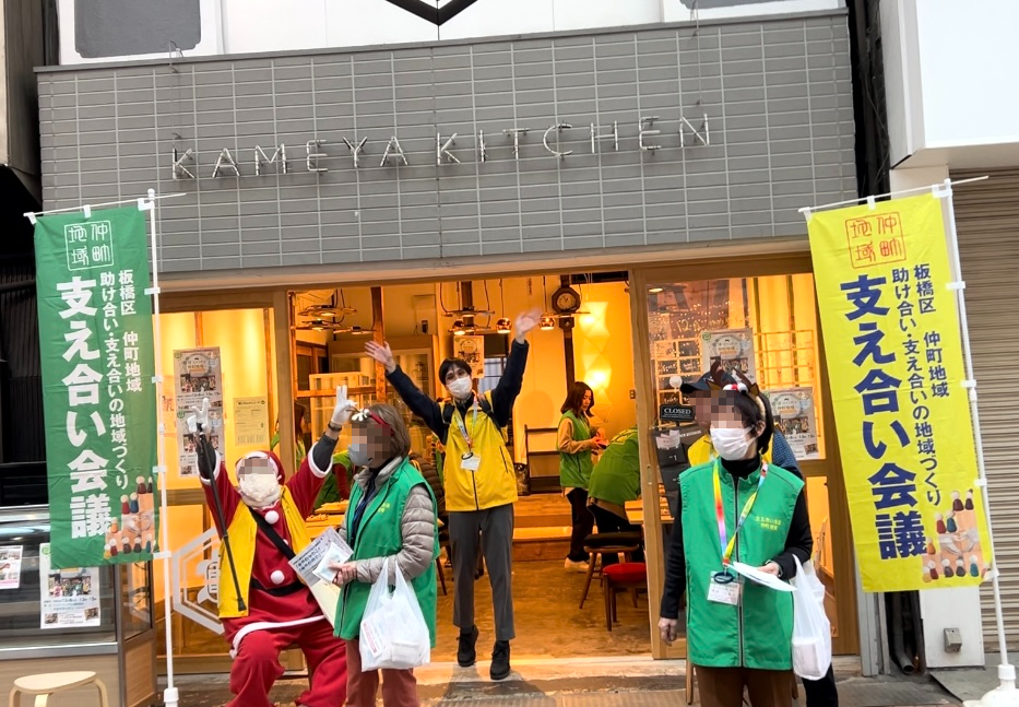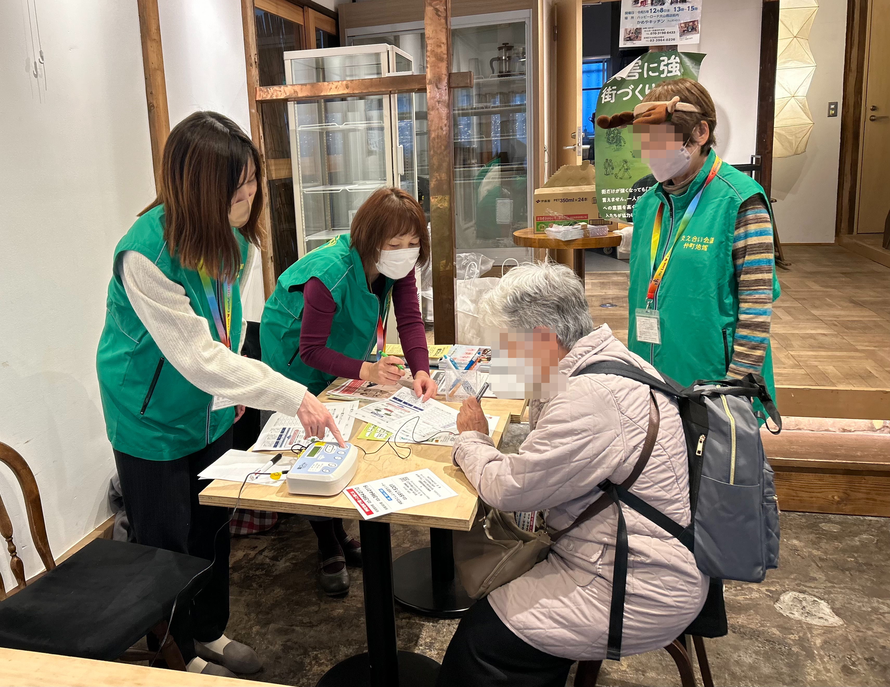 支え合い会議仲町のメンバーが集まり、地域の方にお声掛けしながら、支え合い会議仲町のリーフレットやウェットティッシュを配ったり、かめやキッチン内では、なんでも福祉相談や健康測定を行いました。