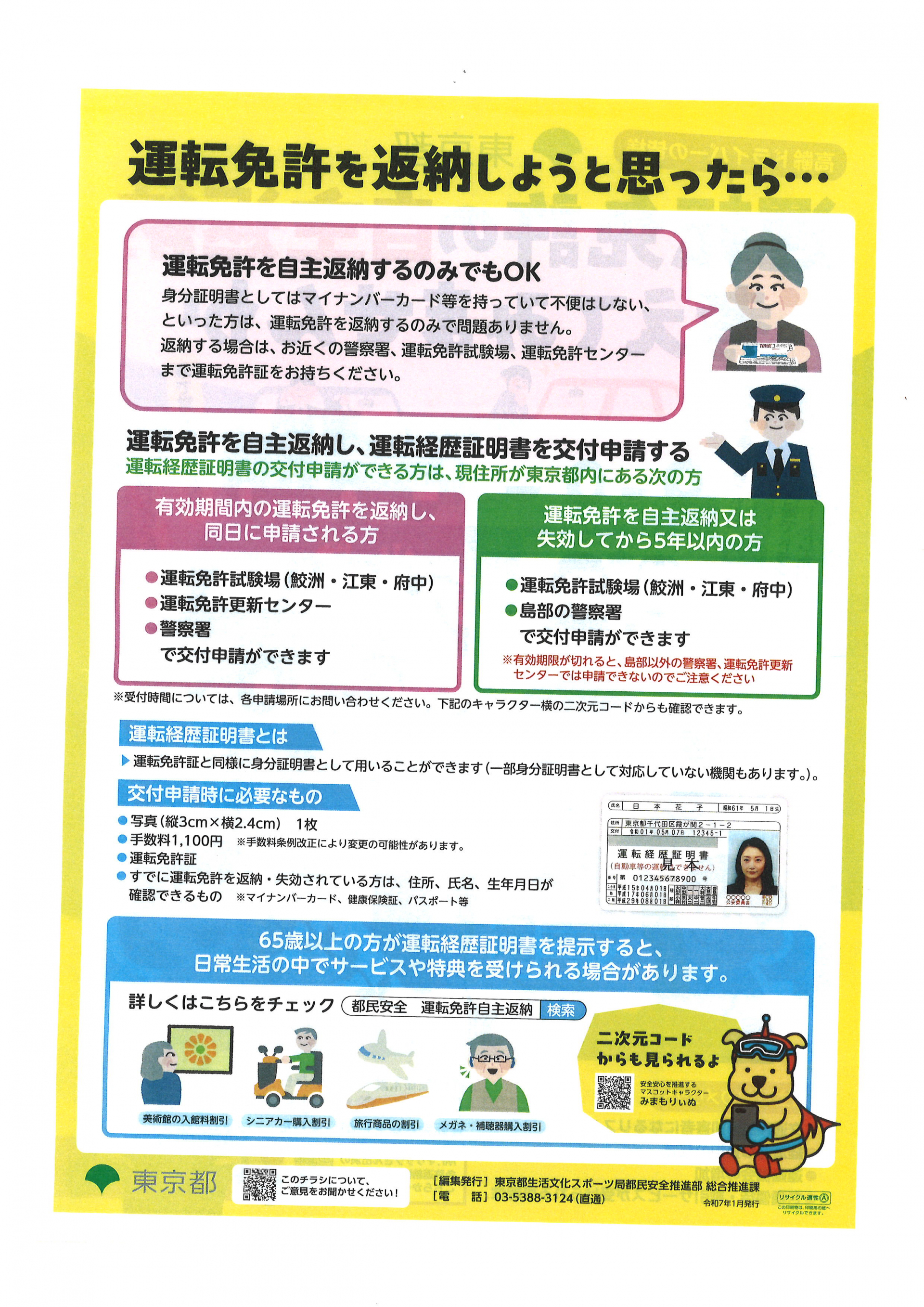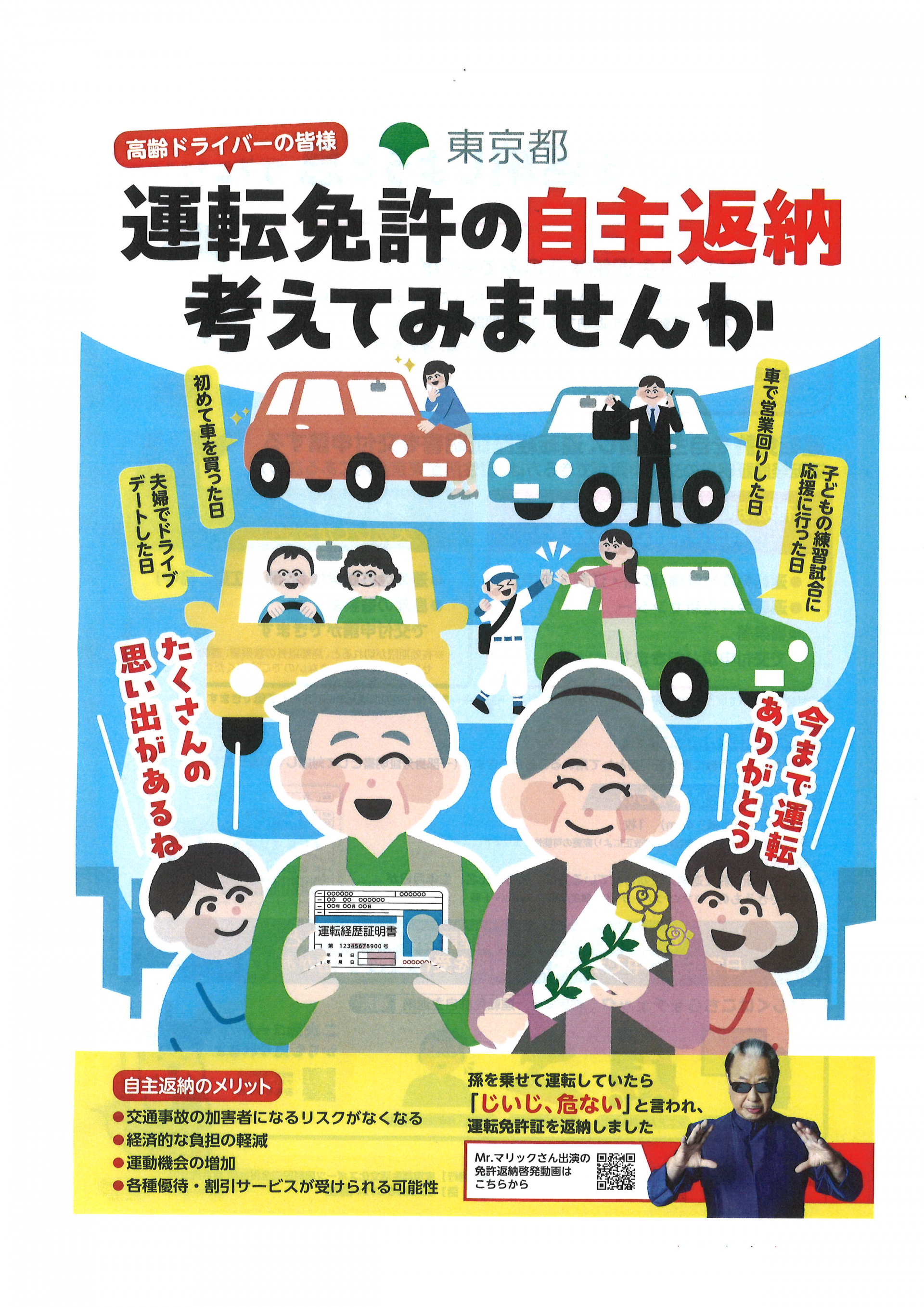 2025.03.19 お知らせ 【仲町包括】免許返納について Tweet シェアする 事故により被害者や加害者にならない事が重要です。適切な時期に、免許を返納して健康維持・増進できれば好ましく思います。 前の記事 2025.03.24 お知らせ 【仲町包括】防災の研修に参加しました 次の記事 2025.03.18 お知らせ 【仲町包括】体操教室を開催しました! 一覧へ戻る