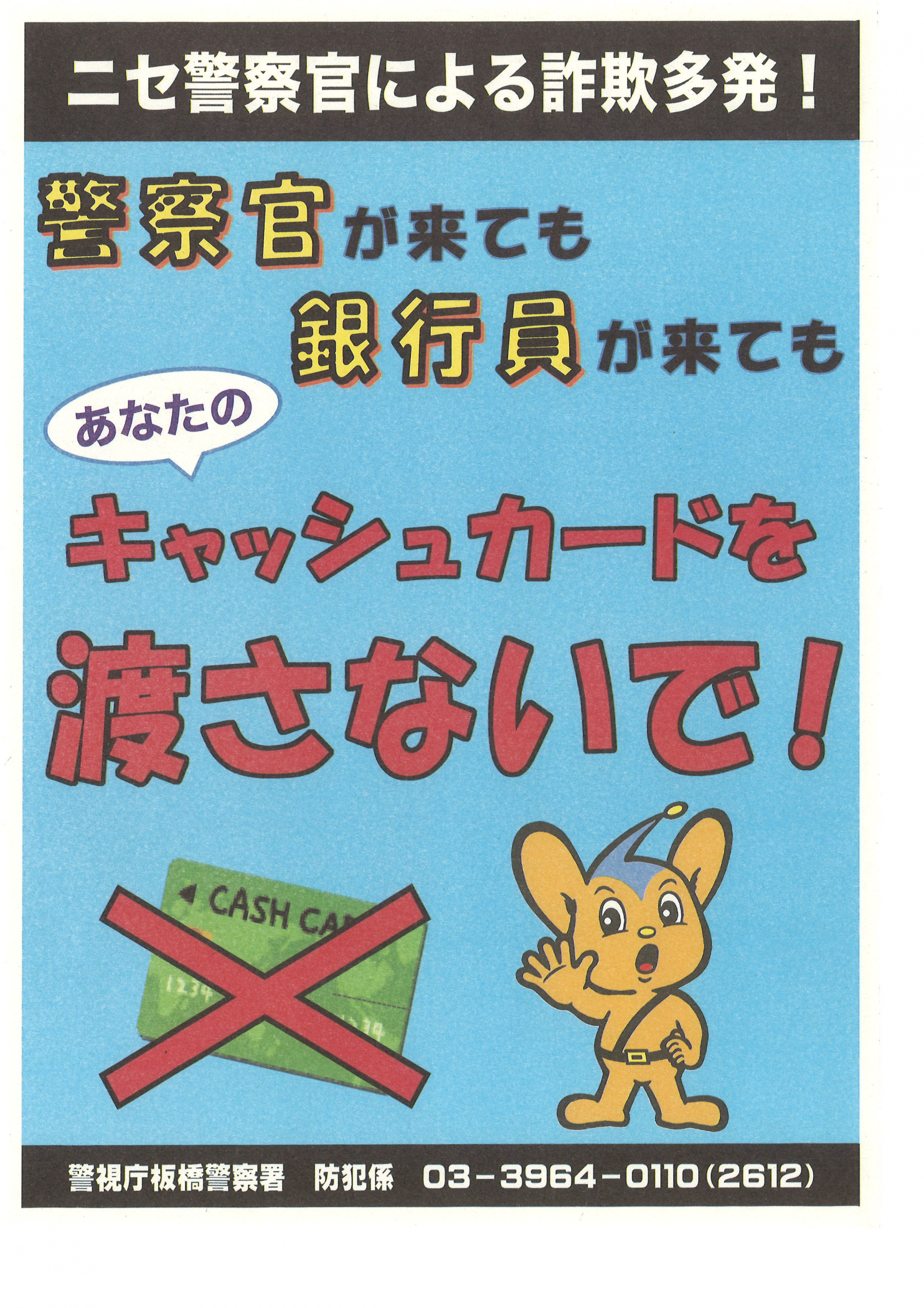 2025.01.13 お知らせ 【仲町包括】キャッシュカードは渡さない Tweet シェアする 詐欺の手口が巧妙化しており、最近はニセの警察官や銀行員が現れるそうです。いかなる理由があっても、安易にキャッシュカードを渡さないように気を付けて下さい。 前の記事 2025.01.15 お知らせ 【仲町包括】1月の体操教室のご案内 次の記事 2025.01.11 お知らせ 【仲町包括】感電ブレーカーについて 一覧へ戻る