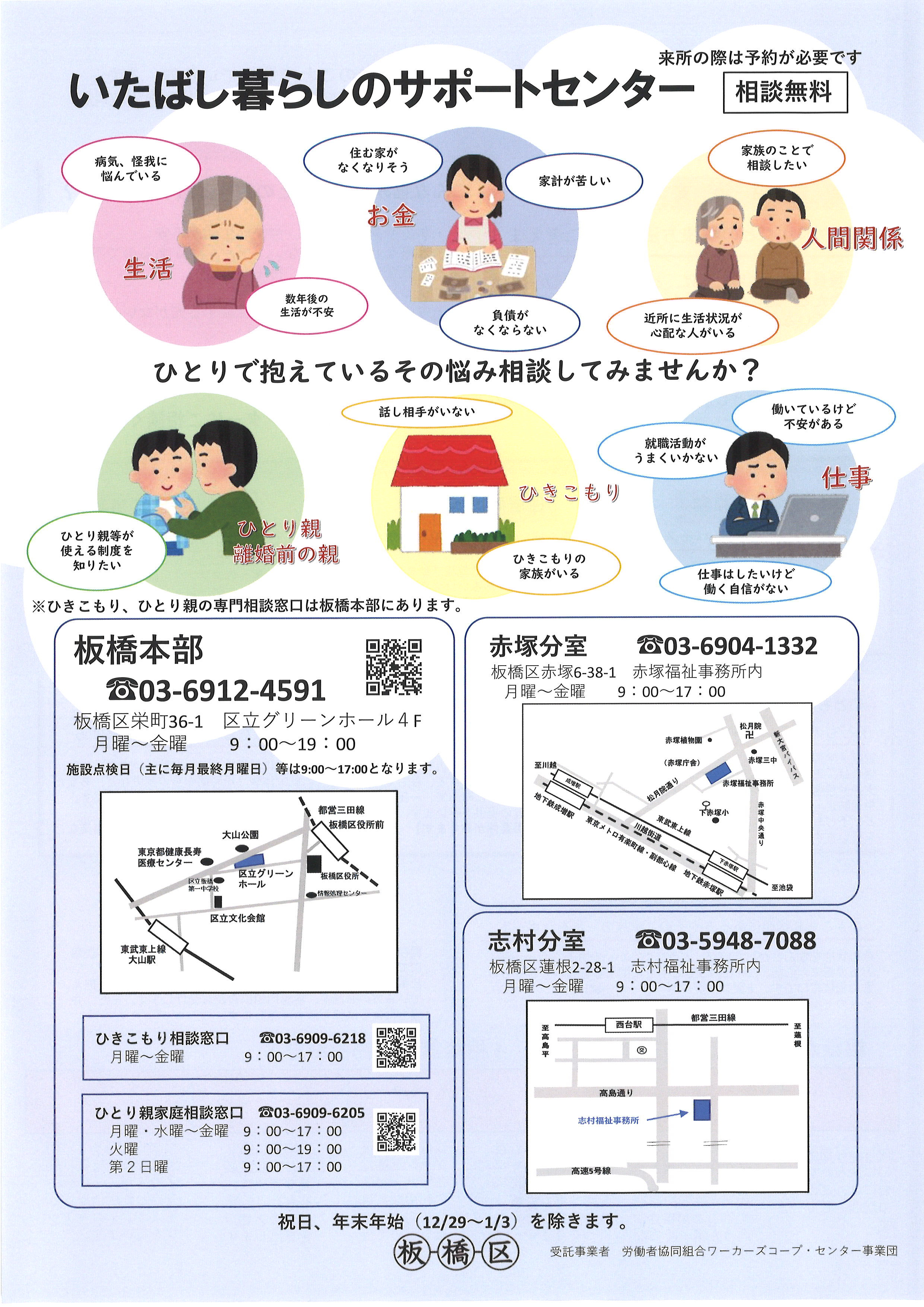 2025.11.09 お知らせ 【仲町包括】いたばし暮らしのサポートセンター Tweet シェアする 自らの周囲における人間関係では、支援の力が及ばない。そんな時には、公的機関へ支援のご相談が必要かも知れません。1人で頑張り過ぎないようにする事も大切な事です。 前の記事 2025.11.10 お知らせ 【仲町包括】予防接種 次の記事 2025.11.08 お知らせ 【仲町包括】板橋区療養相談室のご案内 一覧へ戻る