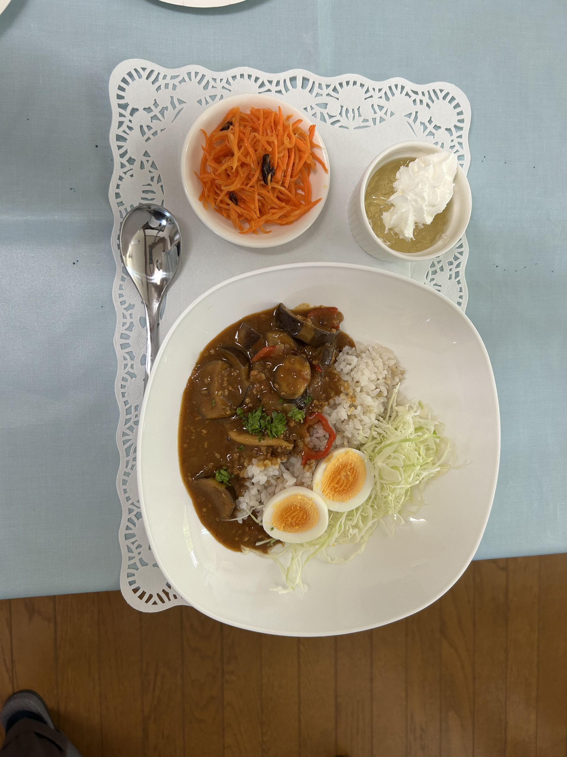 今月のカレーは 豆カレーです。おいしいデザートつきです。