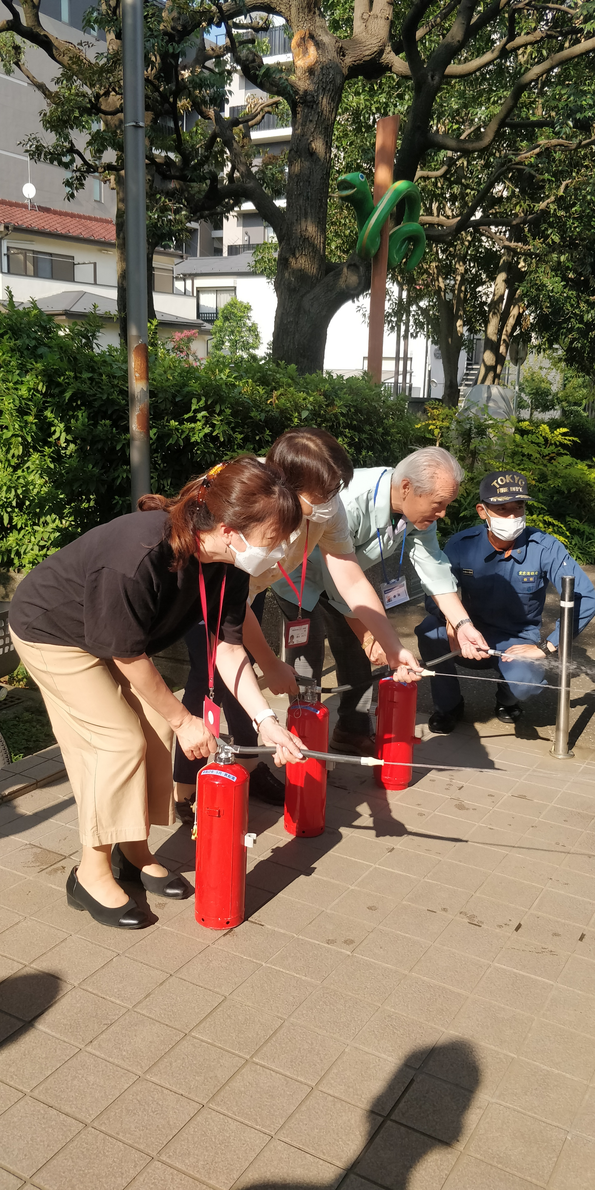 その後は皆で外に出て、水消火器を使用した放水訓練を行いました。ピンを外した後の安全な消火器の運び方を知れたことが一番良かったです。