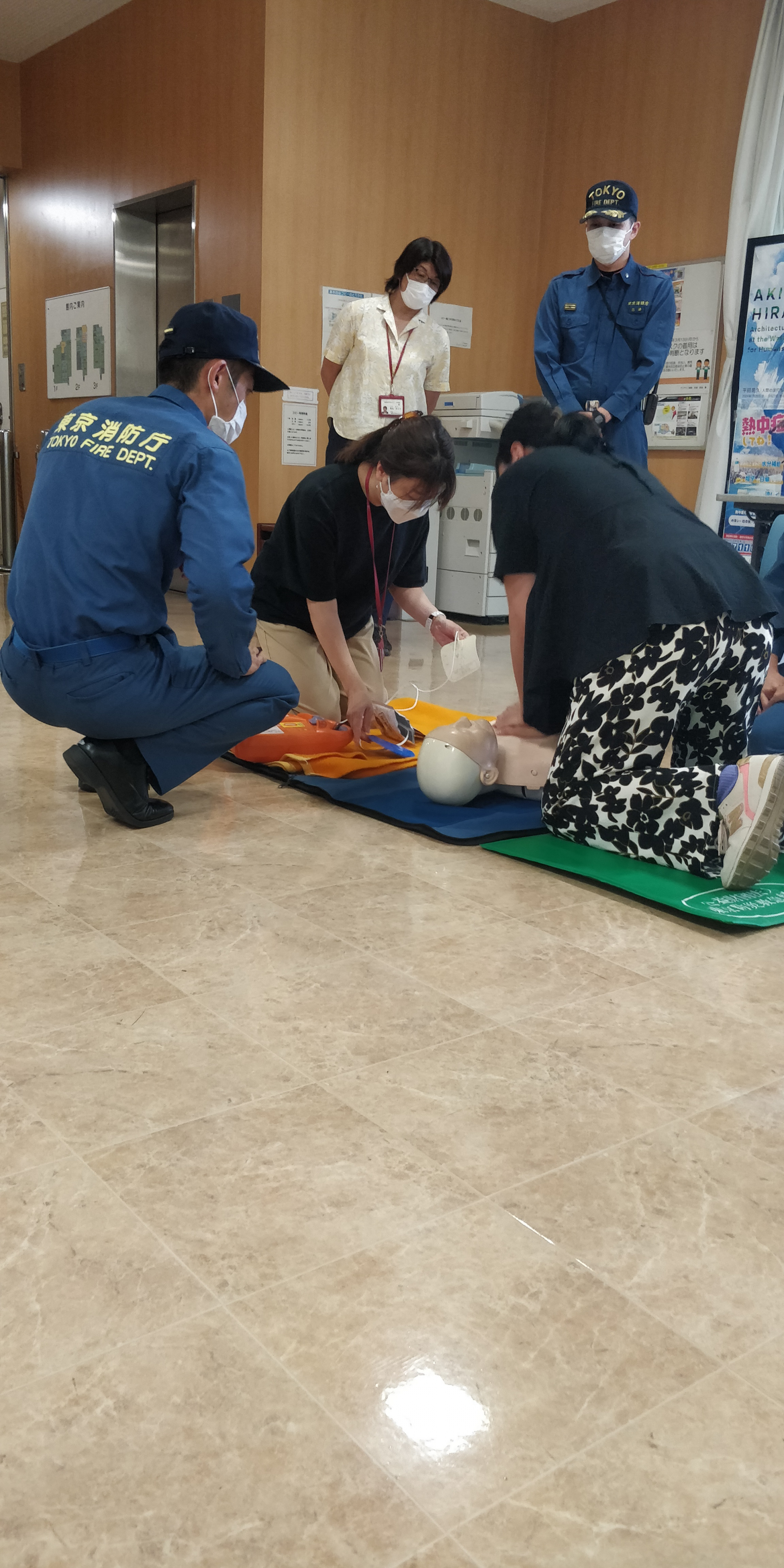 練馬消防署から3名の消防士さんが来てくださり、倒れている傷病者を発見・助けを呼ぶところからAEDを使用するところまで、役割を交代しながら実践し、アドバイスや注意をいただきました。私は心臓マッサージ中にAEDのパッドを貼ることを躊躇してしまいました。