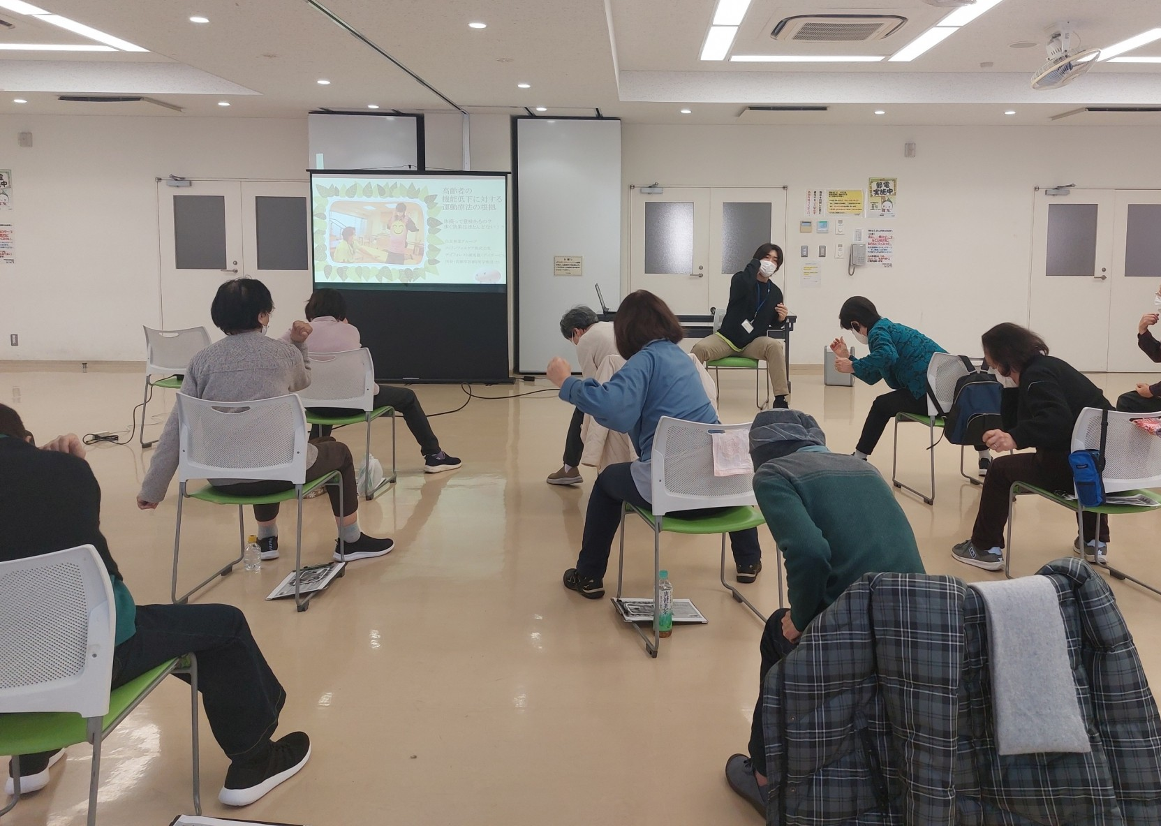 デイサービスの理学療法士さんを講師にお迎えし、前半は高齢者の機能低下に対する運動療法の根拠についての講義、後半は座ってできる運動講座をしていただきました。