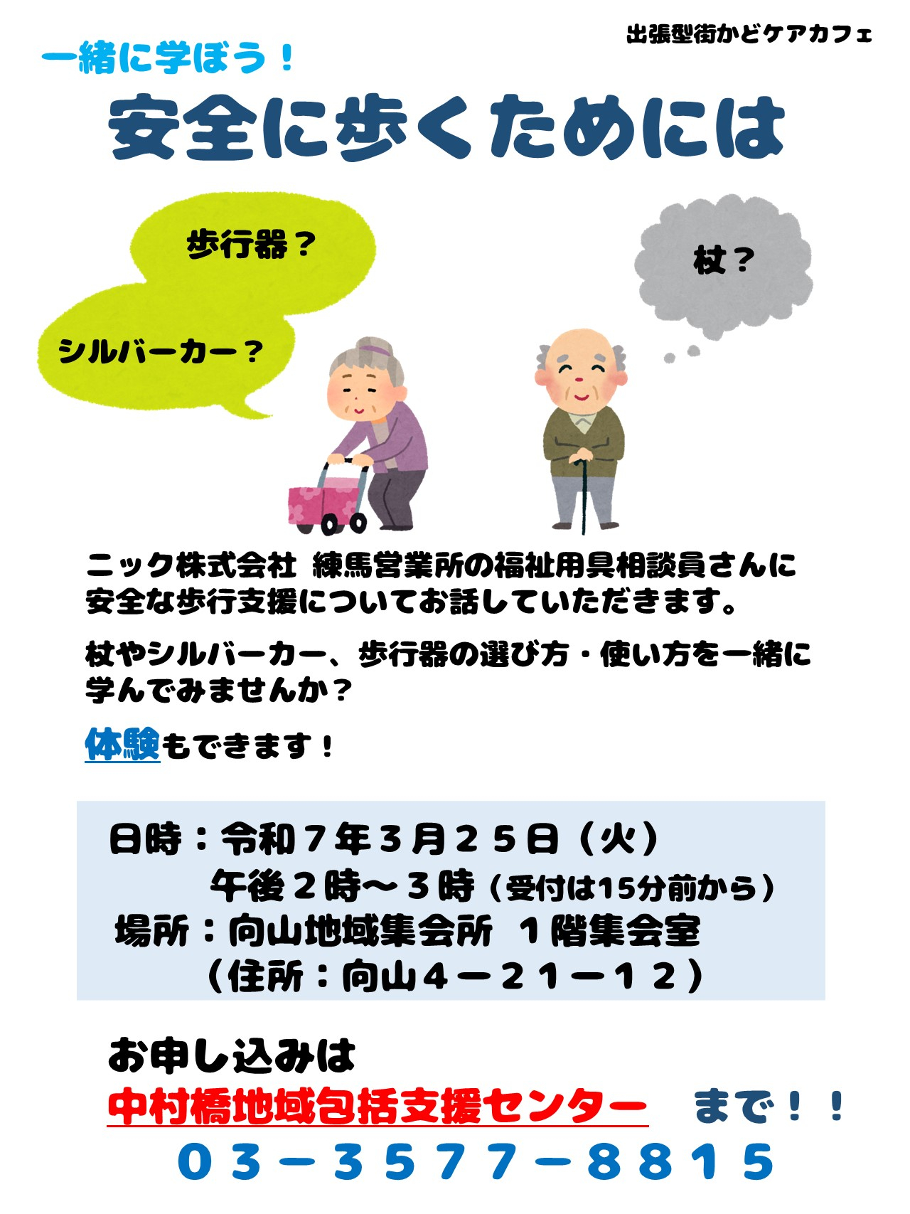 中村橋地域包括支援センターでは、3月25日に向山地域集会所にて「一緒に学ぼう!安全に歩くためには」講座を開催予定です。