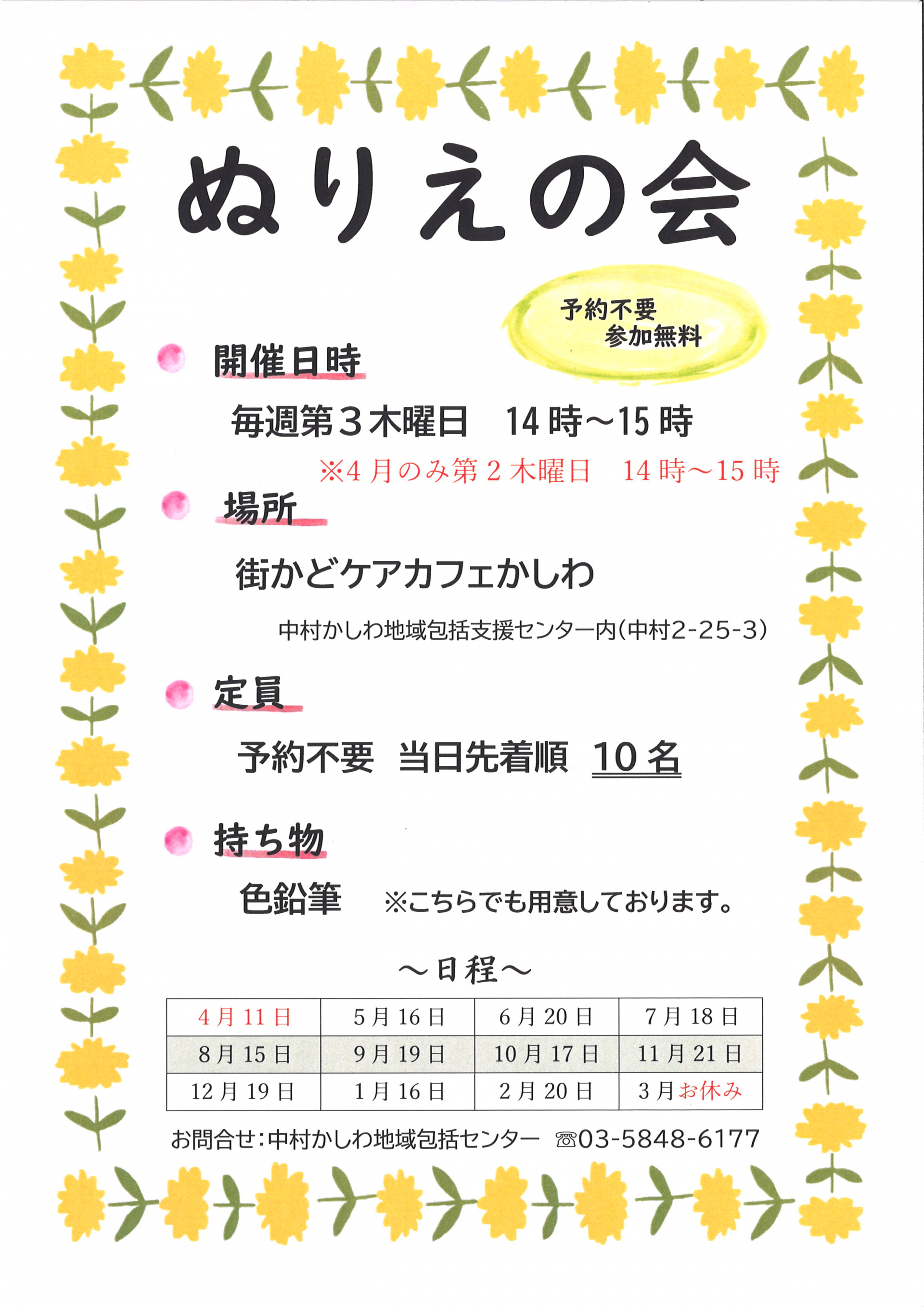 2024.04.08 お知らせ 【ケアカフェかしわ】4/11「ぬりえの会」を開催します! Tweet シェアする ぬりえの会を開催します! 日程:4月11日(木)14時~15時 予約不要です。色鉛筆や素材はこちらでも用意しています。 ぜひご参加ください! 中村かしわ地域包括支援センター #ぬりえ 前の記事 2024.04.08 お知らせ 【ケアカフェかしわ】スマホ講座が開催されました! 次の記事 2024.04.06 お知らせ 【ケアカフェかしわ】4/9 小物づくりを開催します! 一覧へ戻る