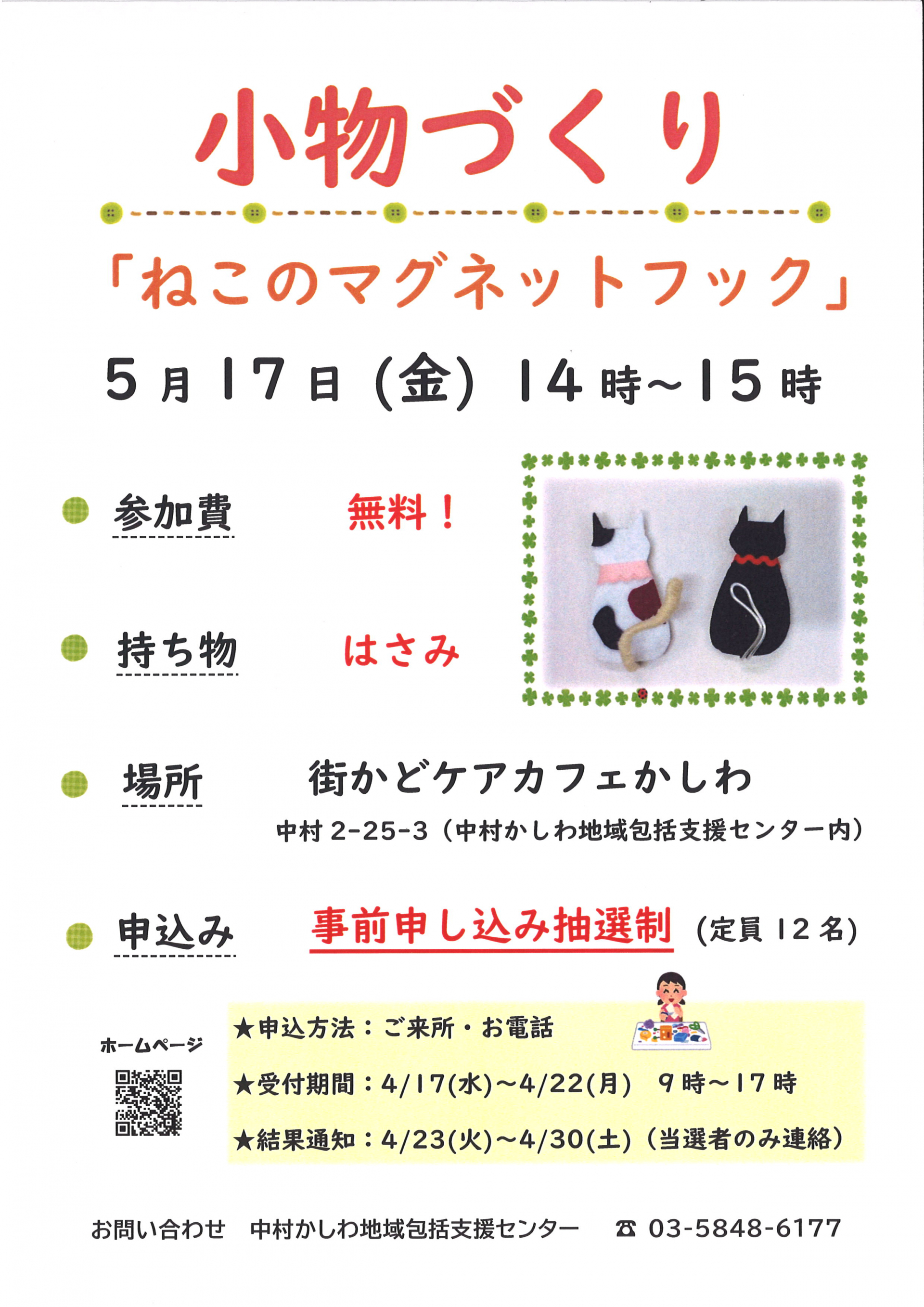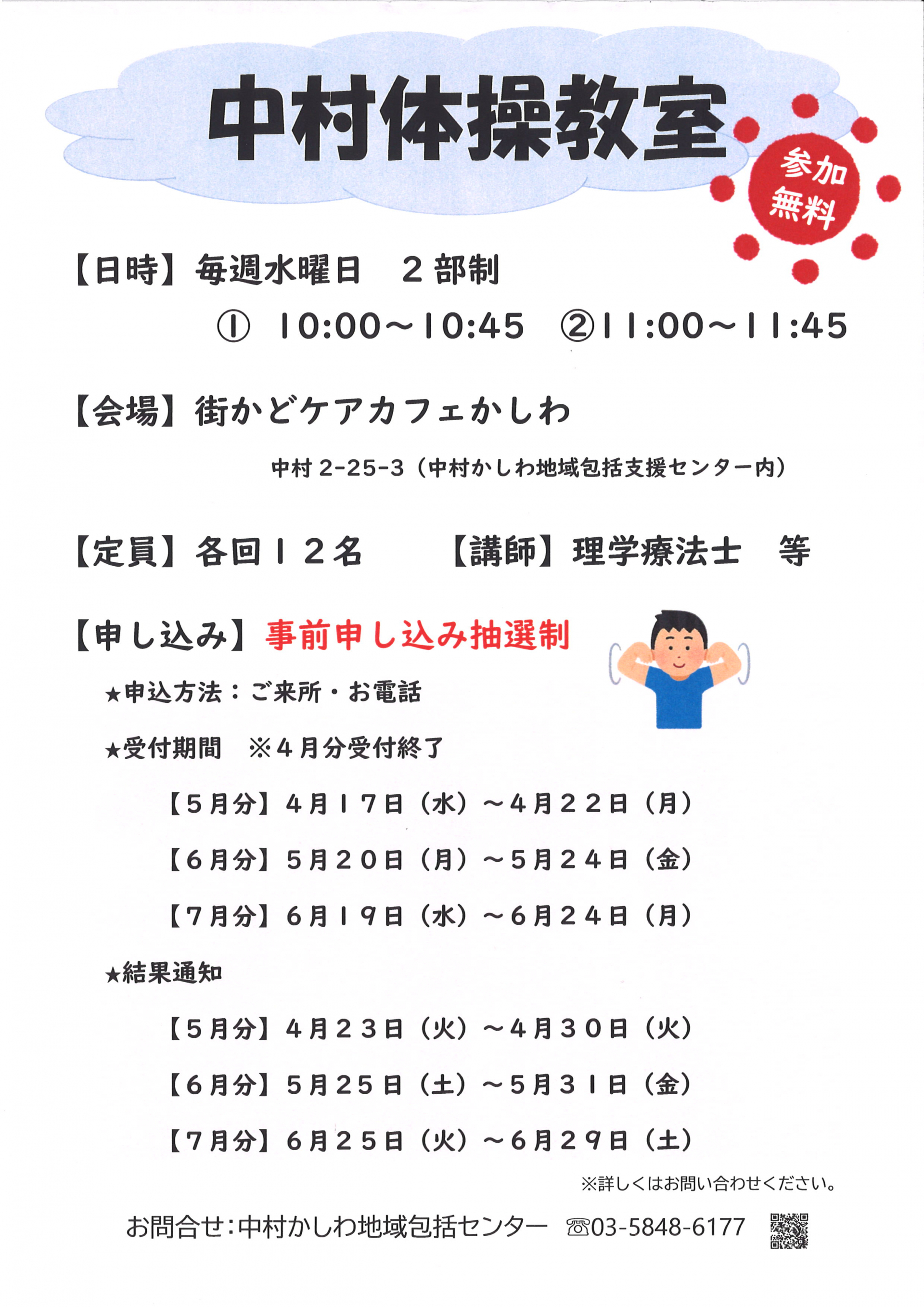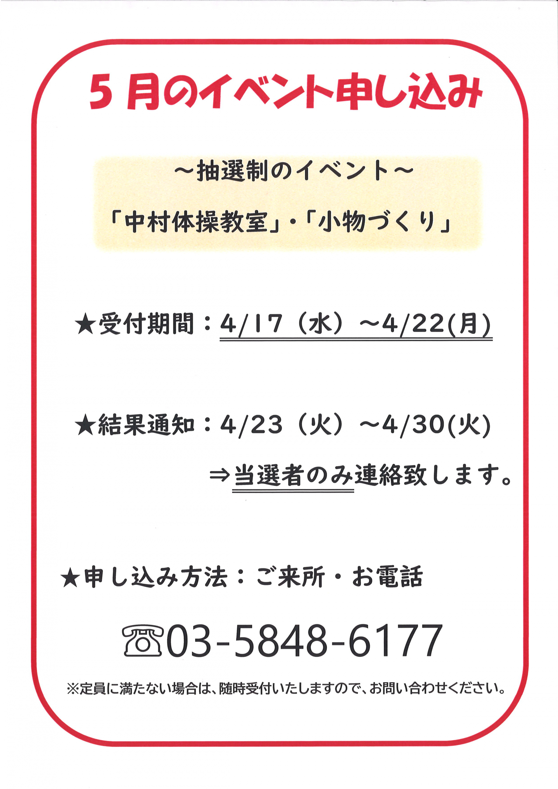 ~5月の「中村体操教室」と「小物づくり」の抽選期間~