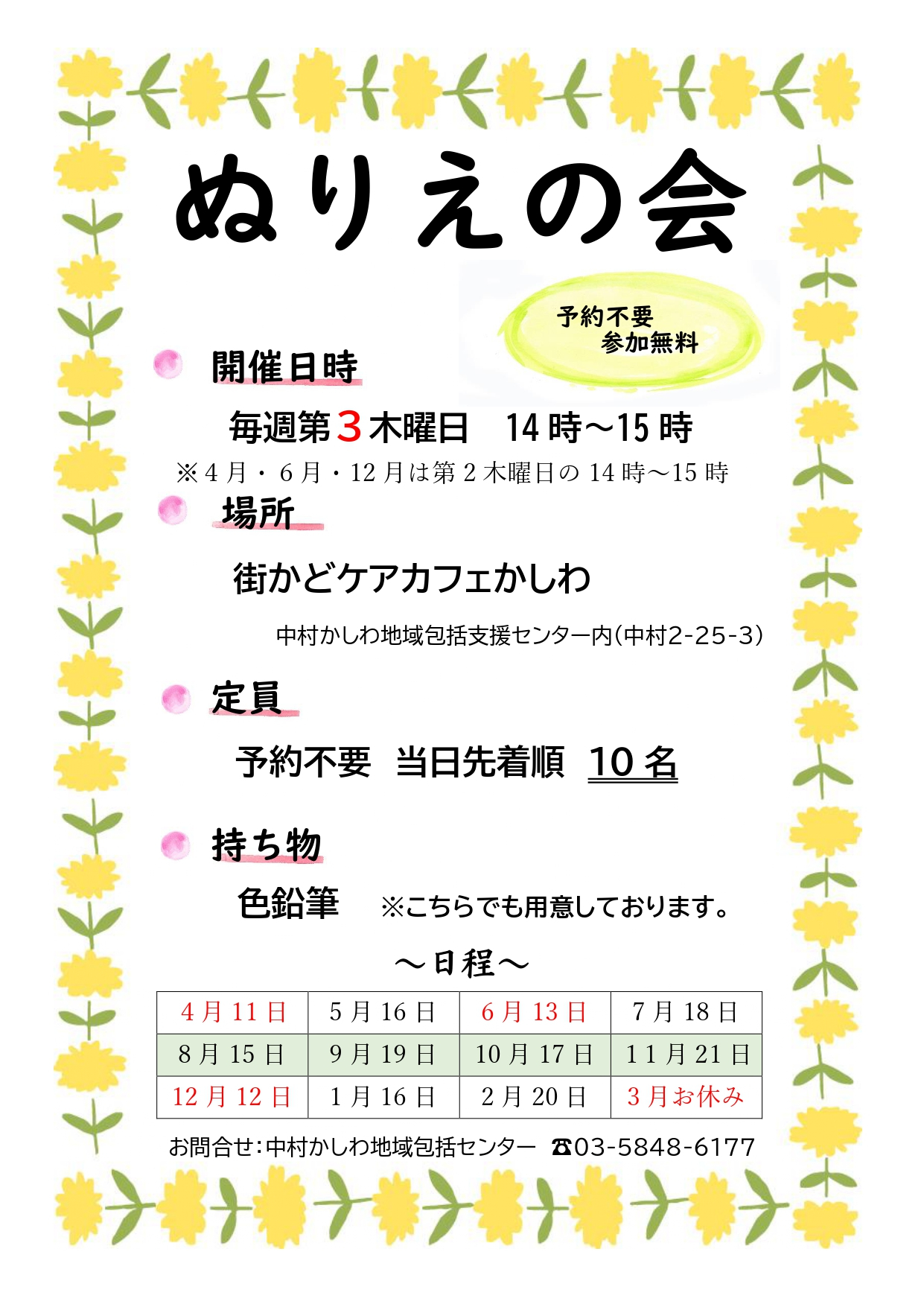 以下の日時で、毎月恒例の「ぬりえの会」を開催します!