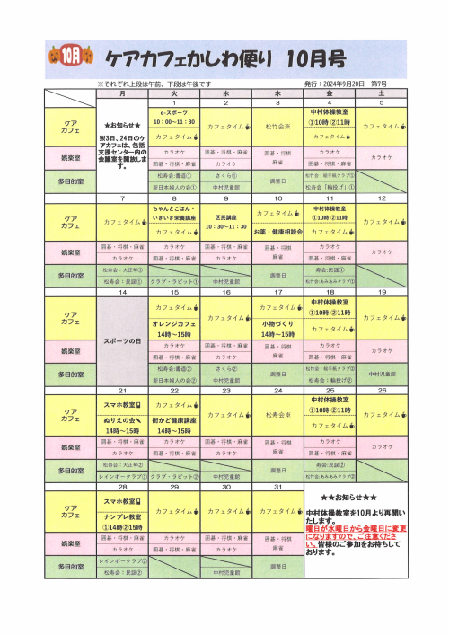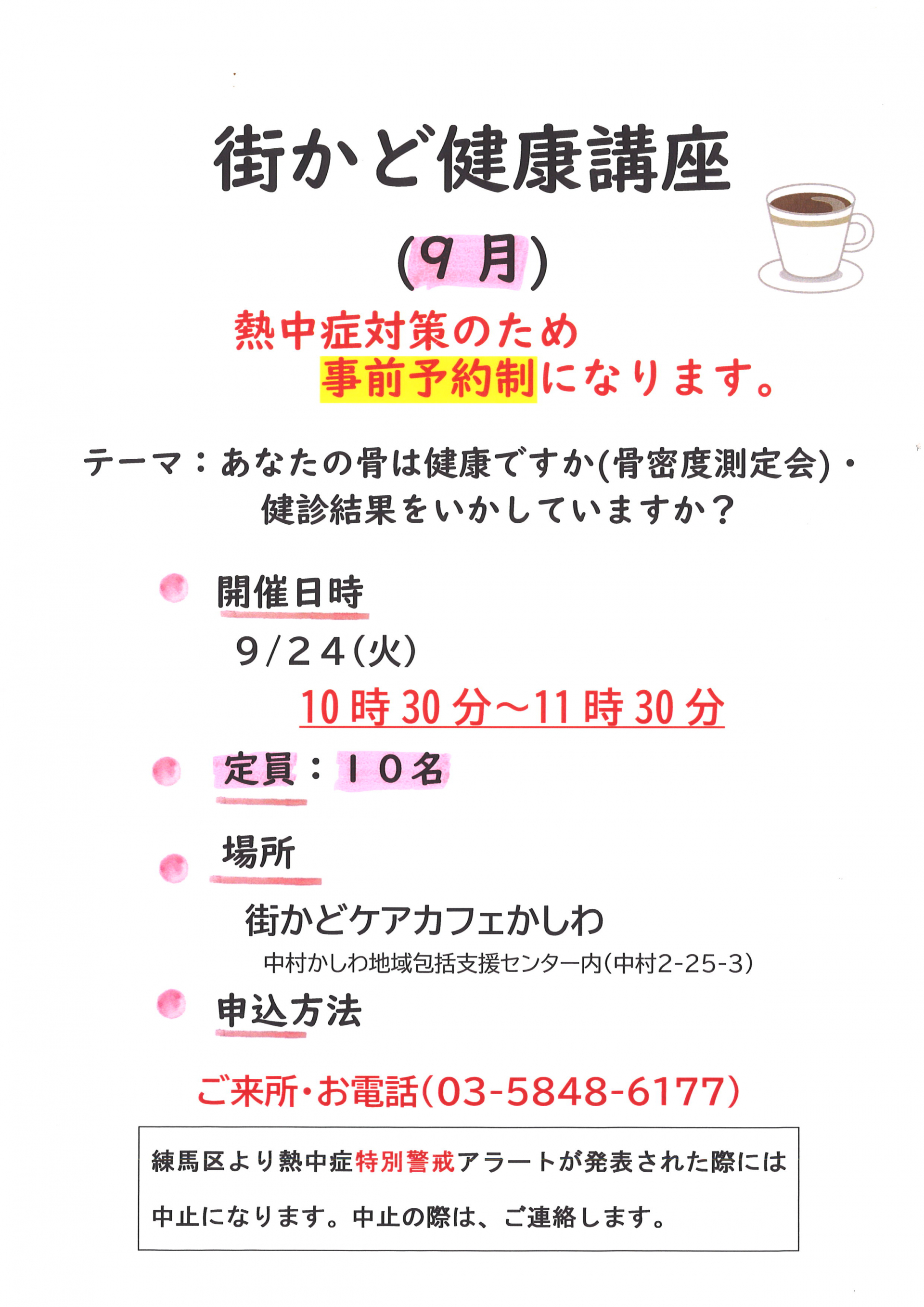 2024.09.19 お知らせ 【中村かしわ包括】街かど健康講座を開催します。 Tweet シェアする 来る9月24日(火)に、街かど健康講座を開催します。 皆さまのご参加、お待ちしております。 中村かしわ地域包括支援センター 高嶋 前田 前の記事 2024.09.20 お知らせ 【中村かしわ包括】ケアカフェかしわ便り10月号 次の記事 2024.09.19 お知らせ 【中村かしわ包括】敬老の日お祝いイベントを開催しました 一覧へ戻る