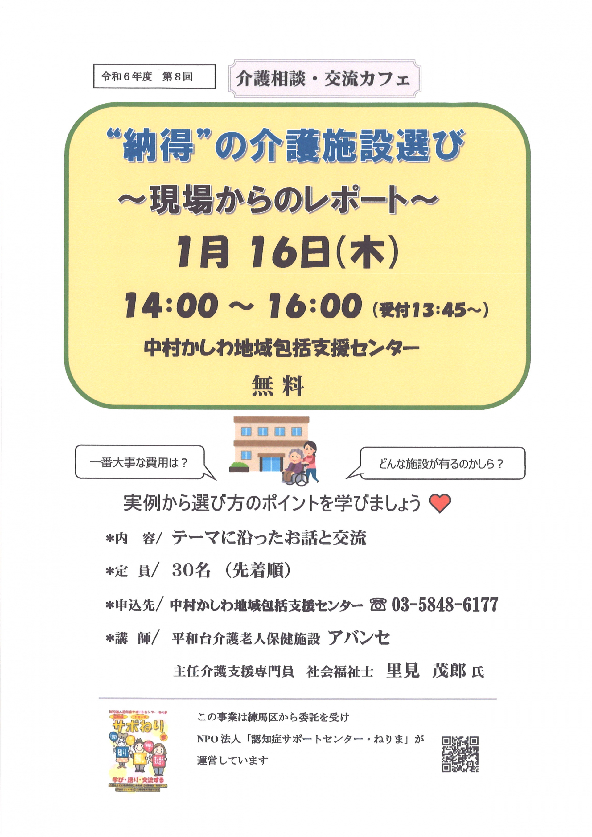 2024.12.10 お知らせ 【中村かしわ】「”納得”の介護施設選び」を開催します。 Tweet シェアする 来年、1/16(木)14:00~16:00 ”納得”の介護施設選び~現場からレポート~ を開催します。 是非ご参加ください。 中村かしわ地域包括支援センター 前田・高嶋 #奉優会 #イベント 前の記事 2024.12.10 お知らせ 【中村かしわ包括】ぬりえの会を開催しました 次の記事 2024.12.10 お知らせ 【中村かしわ】地域包括ZOOM meetigを開催しました 一覧へ戻る