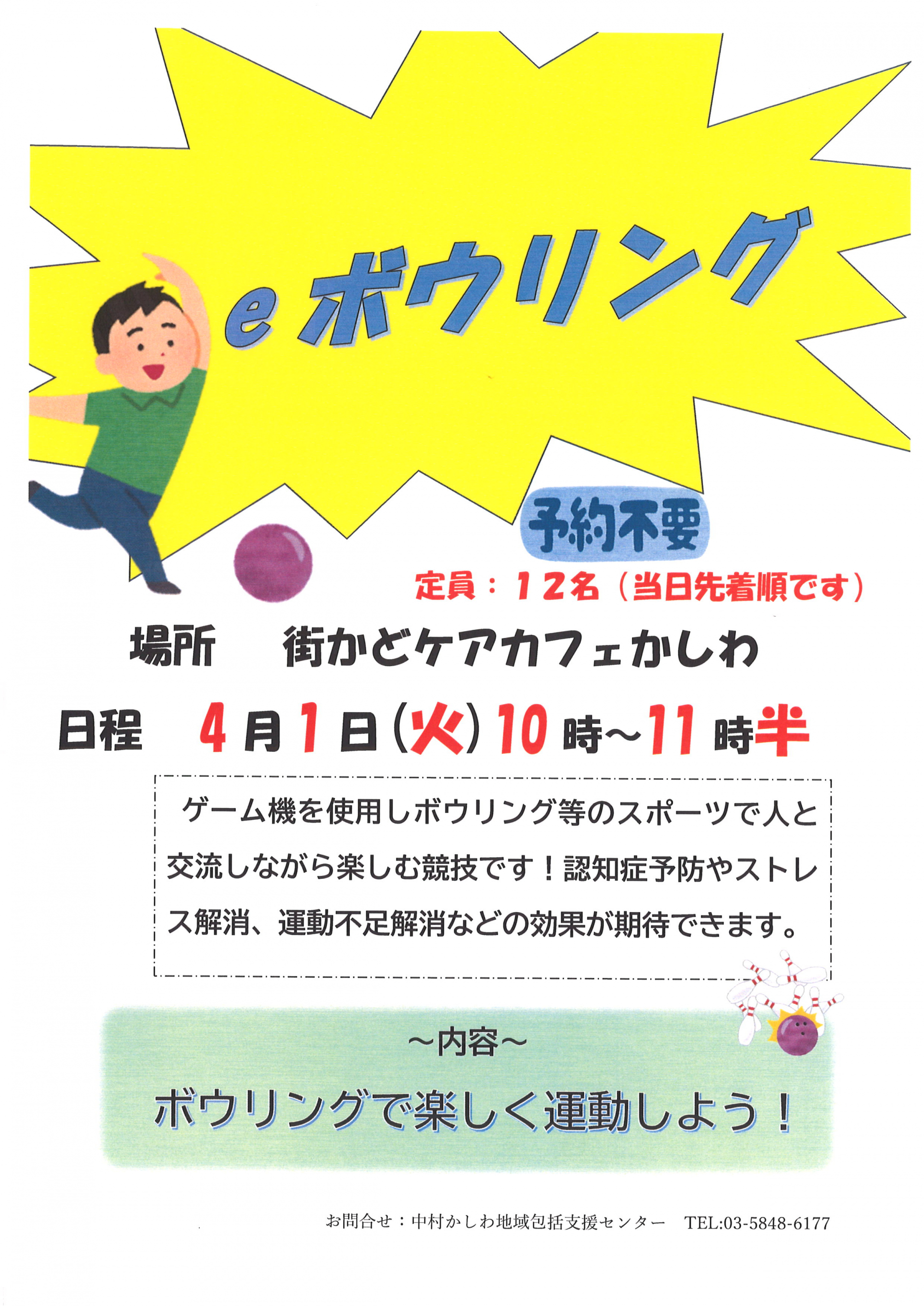 2025.03.04 活動報告 【中村かしわ包括】4/1(火)e-ボウリングを開催します Tweet シェアする 【中村かしわ地域包括支援センター】 4/1(火)e-ボウリングを開催します! 皆さんのお越しをお待ちしております♪ 前の記事 2025.03.04 活動報告 【中村かしわ包括】3/25(火)街かど健康講座を開催します 次の記事 2025.03.04 活動報告 【中村かしわ包括】e-ボウリングを開催しました 一覧へ戻る