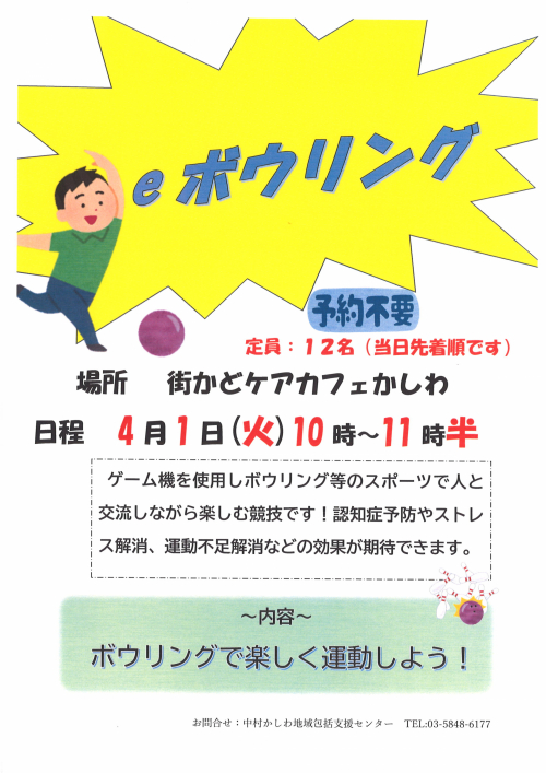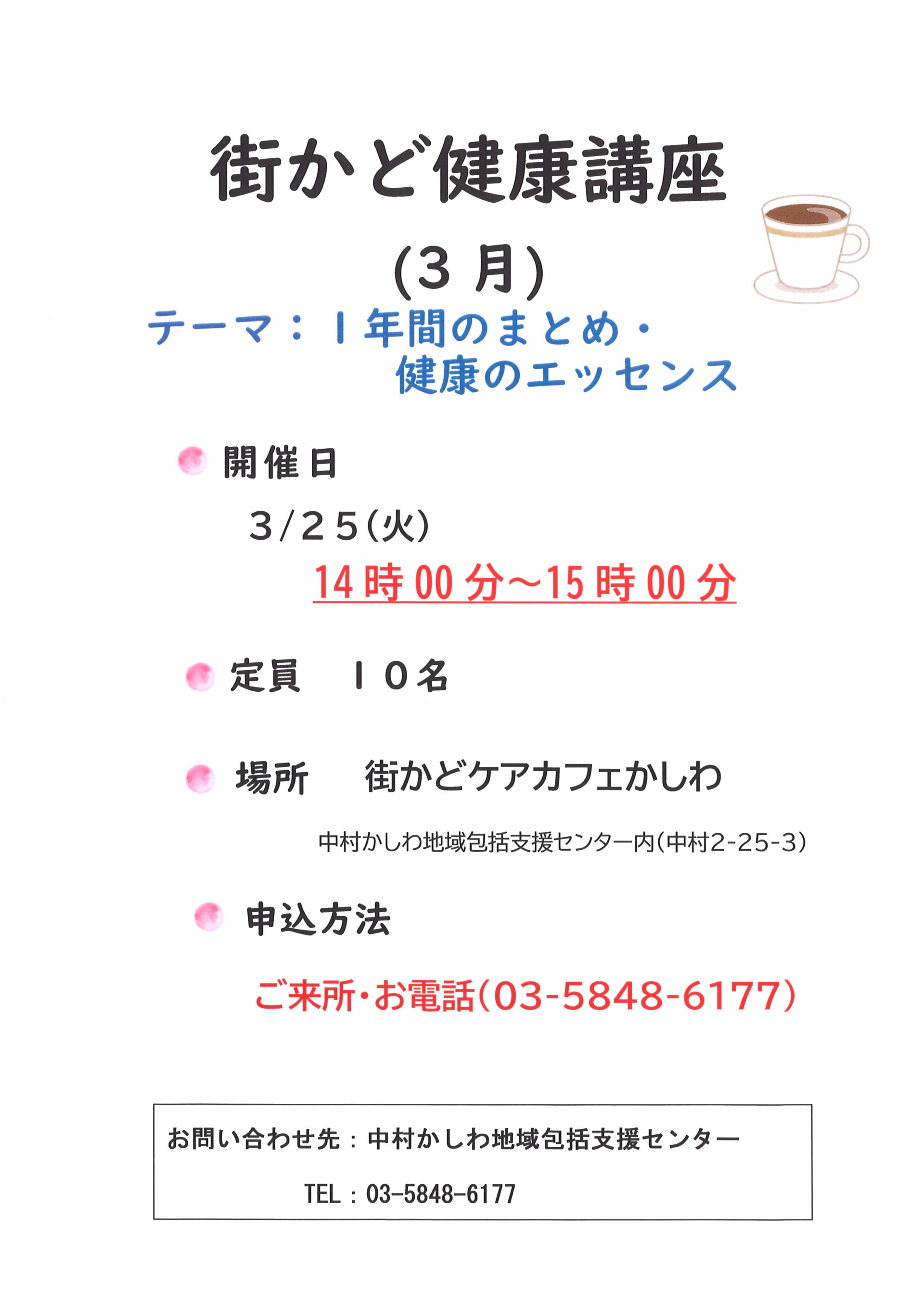 2025.03.04 お知らせ 【中村かしわ包括】3/25(火)街かど健康講座を開催します Tweet シェアする 【中村かしわ地域包括支援センター】 3/25(火)街かど健康講座を開催します! 事前予約制となりますので、ご興味のある方はお電話でお申込みください♪ 前の記事 2025.03.05 お知らせ 【中村かしわ包括】3/11(火)ぬりえの会を開催します 次の記事 2025.03.04 お知らせ 【中村かしわ包括】4/1(火)e-ボウリングを開催します 一覧へ戻る