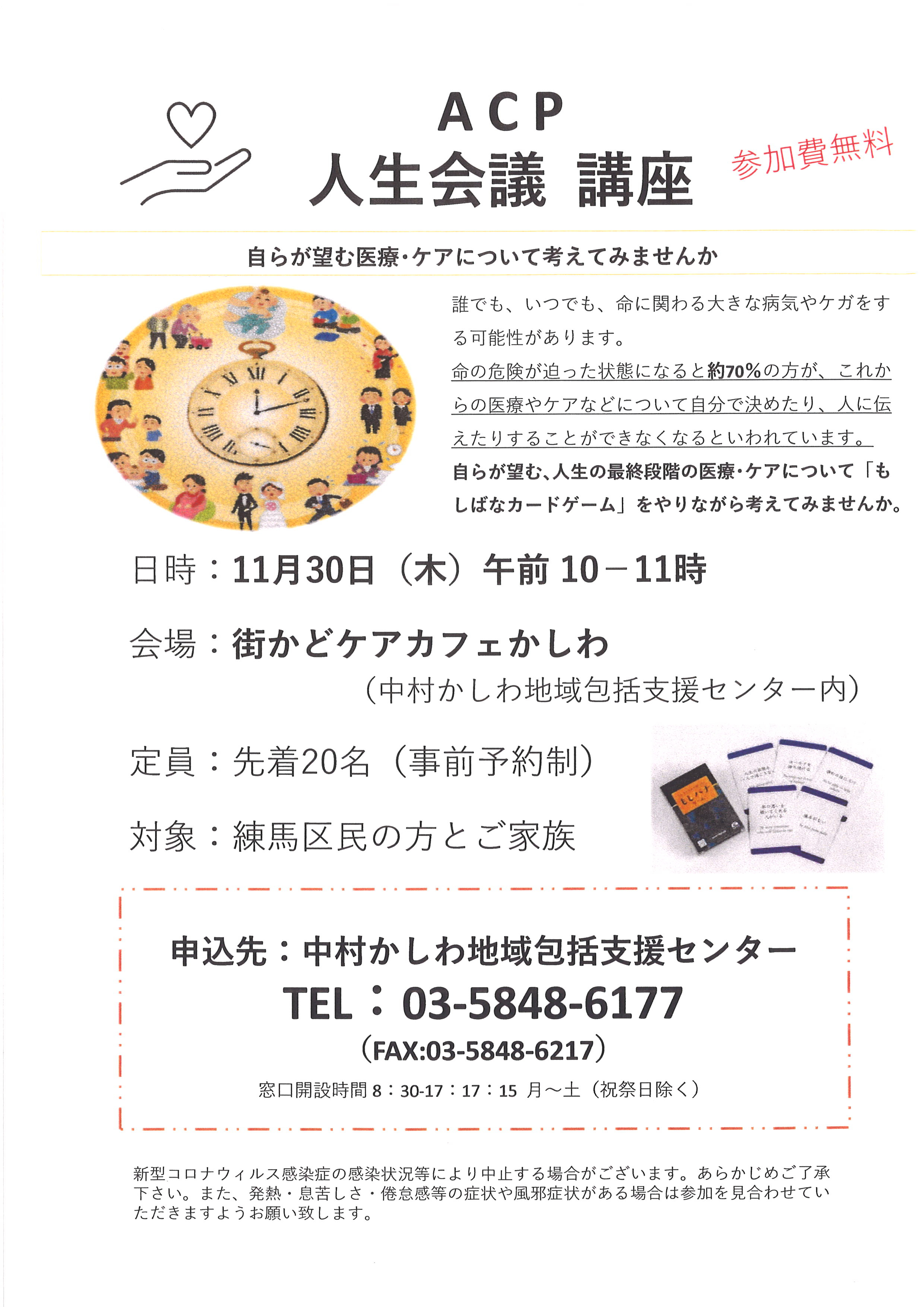 2023.11.14 お知らせ 【中村かしわ包括】ACP人生会議講座を開催します Tweet シェアする 「ACP人生会議 講座」を開催します! 日程:11月31日(木)10時~11時 事前予約制となっています。 ぜひ、ご参加ください! H.R #イベント #カフェ 前の記事 2023.11.15 お知らせ 【中村かしわ包括】栄養講座を開催しました! 次の記事 2023.11.11 お知らせ 中村かしわ包括に本格的な秋がやってきました!! 一覧へ戻る