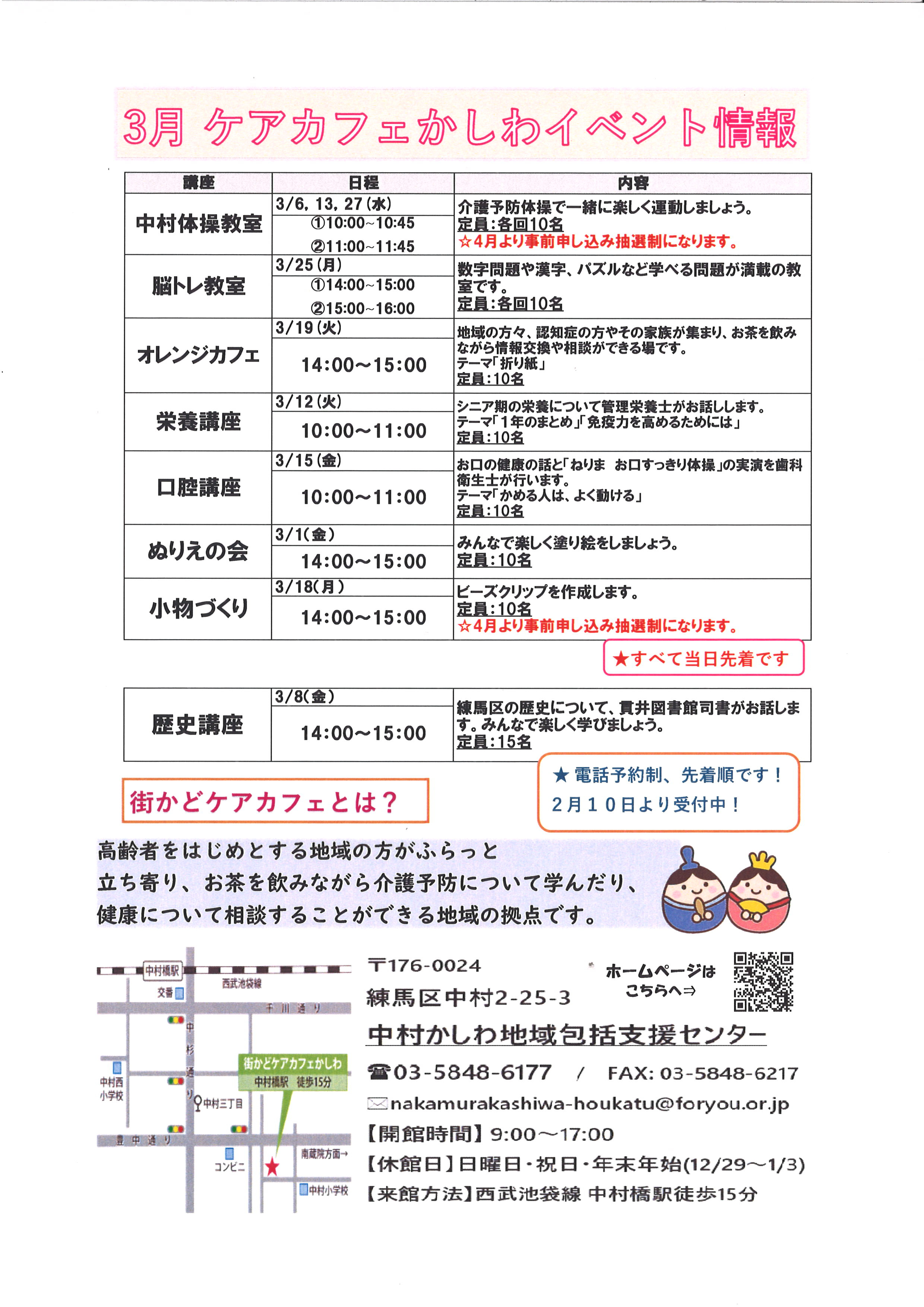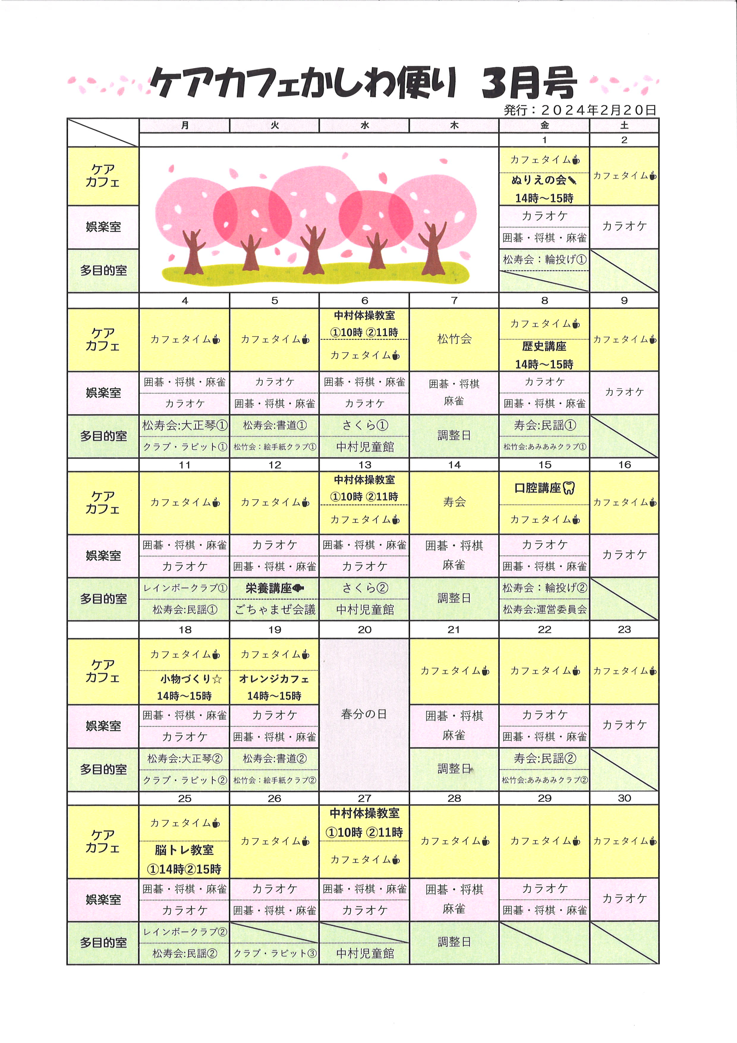 2024.02.20 お知らせ ケアカフェかしわ便り3月号 Tweet シェアする 令和6年3月のケアカフェかしわのスケジュール表が出来ました!! 窓口に用意していますので、来所の際は自由にお取り下さい。 一覧へ戻る