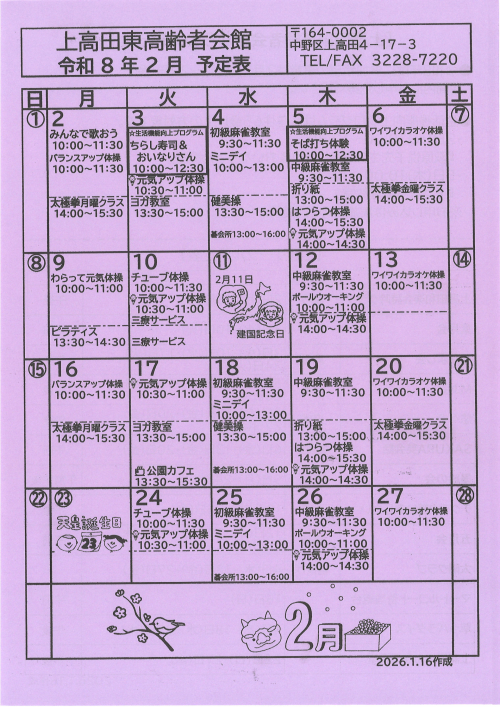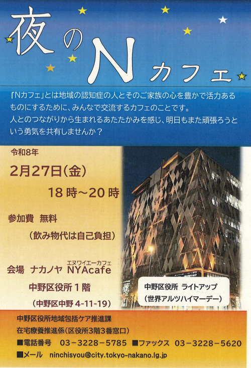 2026.01.24 【中野包括】「とまり木カフェ」を開催しました。 活動報告(IN) 2026.01.24 【中野包括】健幸プラザへリニューアル! お知らせ 2026.01.22 【中野包括】今月のとまり木カフェ お知らせ 2026.01.22 【中野包括】上高田東高齢者会館予定表 ニュース 2026.01.21 「後見人等への意思決定支援研修」に参加しました。 活動報告 2026.01.21 【中野包括】運転免許の自主返納計画! お知らせ 2026.01.21 【中野包括】『若年性認知症支援者多職種研修』のご案内 お知らせ 2026.01.20 【中野包括】「夜のNカフェ」のご案内 お知らせ 2026.01.20 【中野包括】なかの生涯学習大学 ニュース 2026.01.19 【中野包括】都民向け公開講座のお知らせ ニュース 2026.01.19 【中野包括】ケアマネサロン中野 活動報告 2026.01.17 【中野包括】Nカフェ(オレンジカフェ) ニュース 2026.01.17 【中野包括】CMAT・第二ブロック情報交流会に参加しました 活動報告 2026.01.15 【中野包括】ケアマネ部会共催中部圏域ケアマネ交流研修会・事例検討会開催 活動報告 2026.01.14 【中野包括】歩行姿勢測定会 お知らせ 1 2 3 … 31