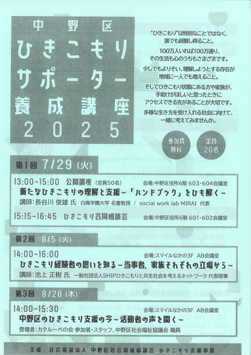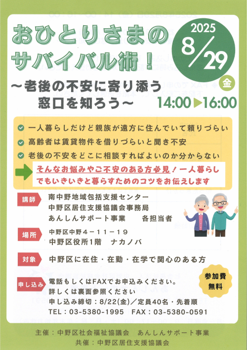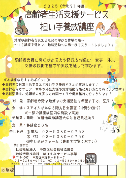 2025.12.16 NEW 【中野包括】おむつ現物申請 お知らせ 2025.12.15 NEW 【中野包括】居場所づくり座談会 お知らせ 2025.12.13 NEW 【中野包括】認知症サポーター養成講座のお知らせ お知らせ 2025.12.11 【中野包括】カタルーべの会 お知らせ 2025.12.10 【中野包括】第5回「中野健幸どまんなか市」を訪れました 活動報告(IN) 2025.11.28 【中野包括】11月度上高田地区民生児童委員協議会に参加しました 活動報告 2025.11.26 【中野包括】ペットの「もしも」に備える ニュース 2025.11.22 【中野包括】防災食の試食体験 お知らせ 2025.11.21 【中野包括】スマホ助成金 お知らせ 2025.11.17 【中野包括】一台二役の歩行器! お知らせ 2025.11.14 【中野包括】R7.11月のとまり木♪ ニュース 2025.11.13 【中野包括】男の健康ボイス野方♪ ニュース 2025.11.12 「健友会 オレンジカフェきょうりつ」に参加しました。 活動報告 2025.11.12 【中野包括】帝京平成大学の学園祭へ 活動報告 2025.11.12 【中野包括】ひきこもり地域家族会「中野わの会」勉強会のお知らせ お知らせ 1 2 3 … 28