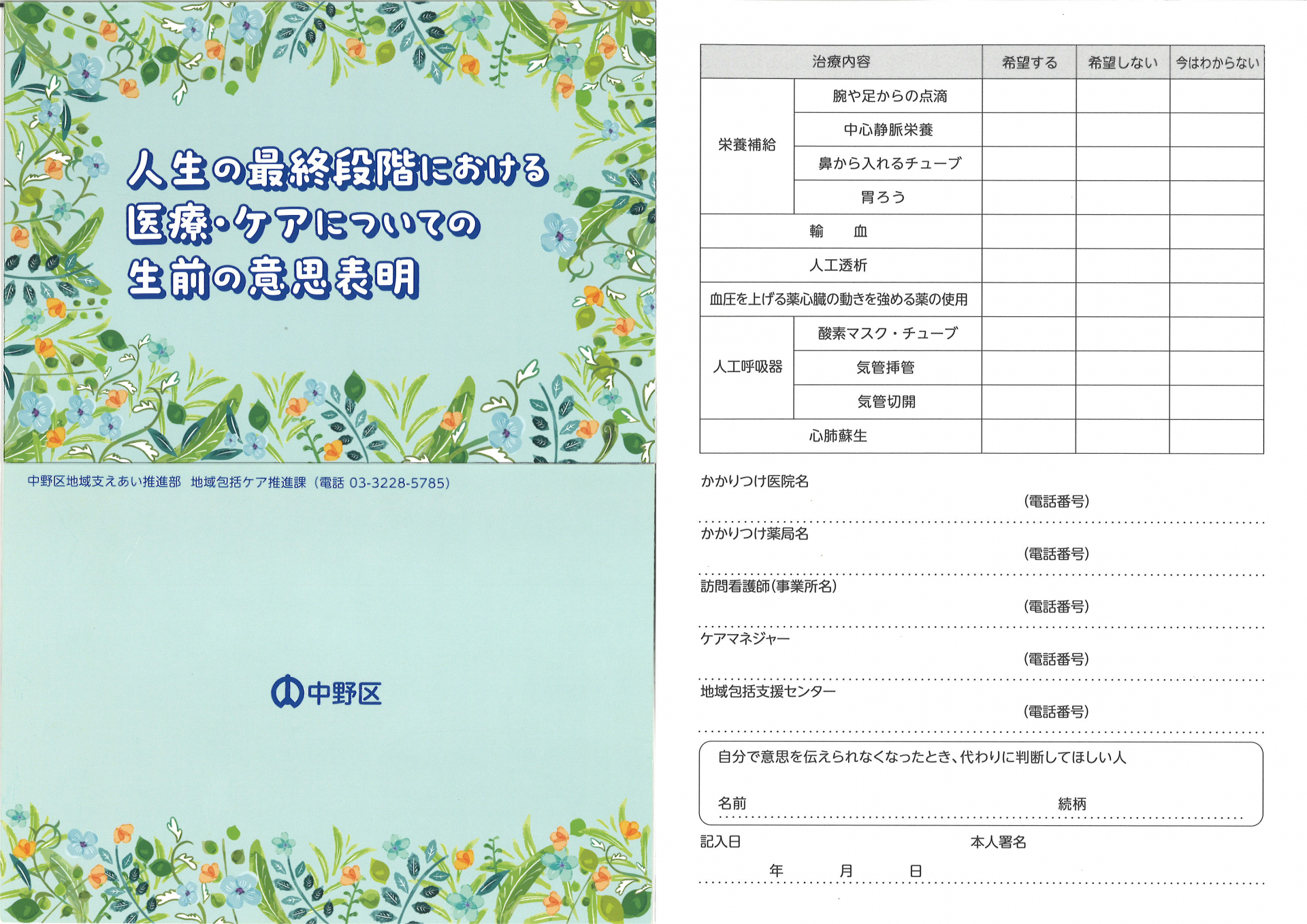 「わたしの思い手帳」と一緒に、人生の最終段階における医療・ケアについての生前の意思表明もお渡ししています。