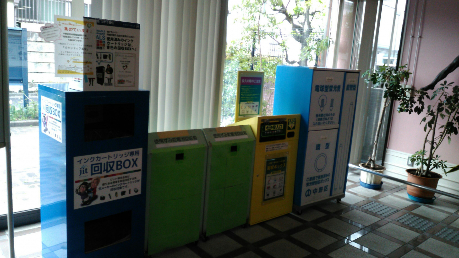 1Fには使用済みのインクカートリッジ、電球、電池などの回収BOXが玄関はいってすぐ左手に設置されていました。