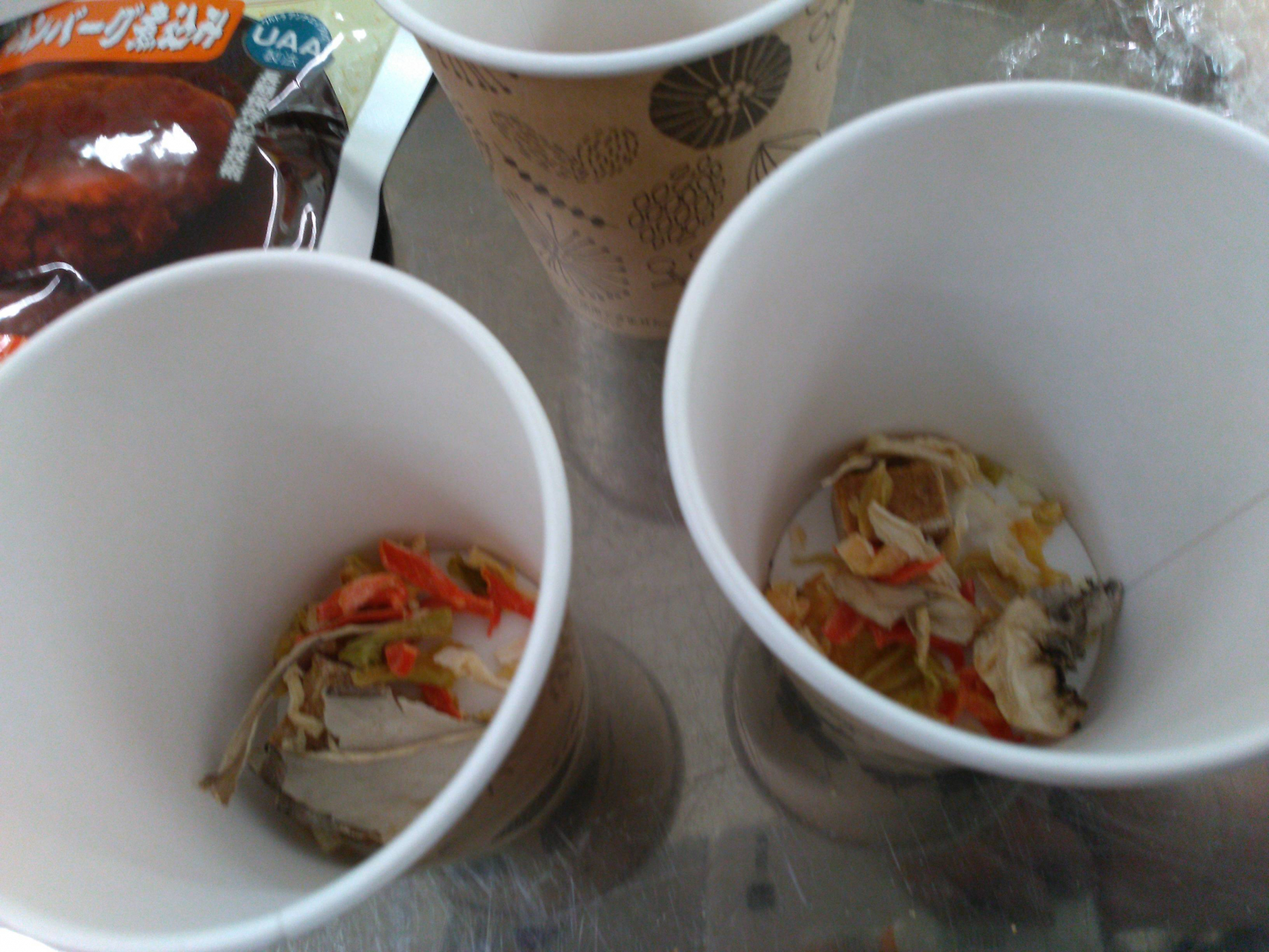 後はコンソメと乾燥野菜、乾燥わかめを入れてお湯を注ぐだけのスープや、