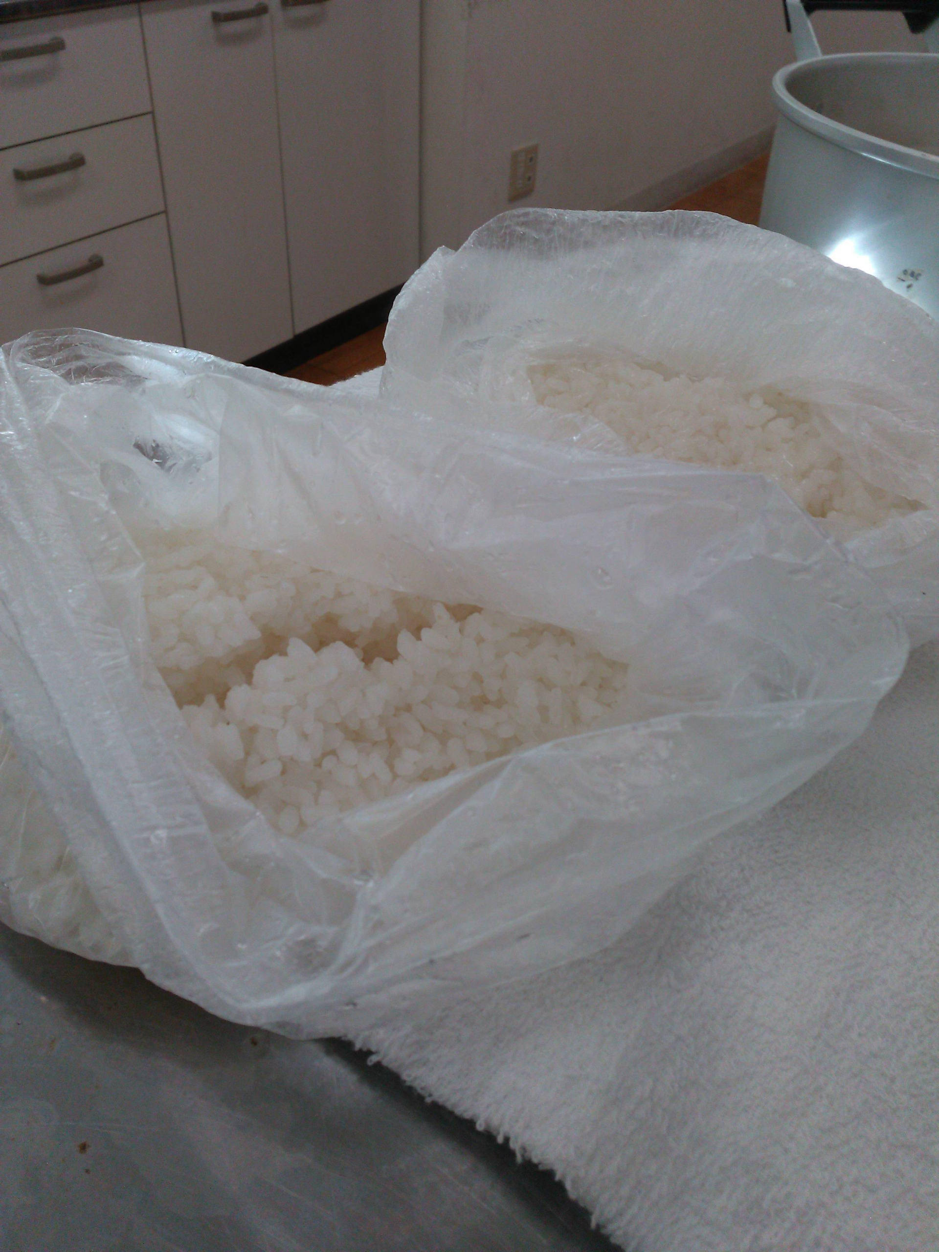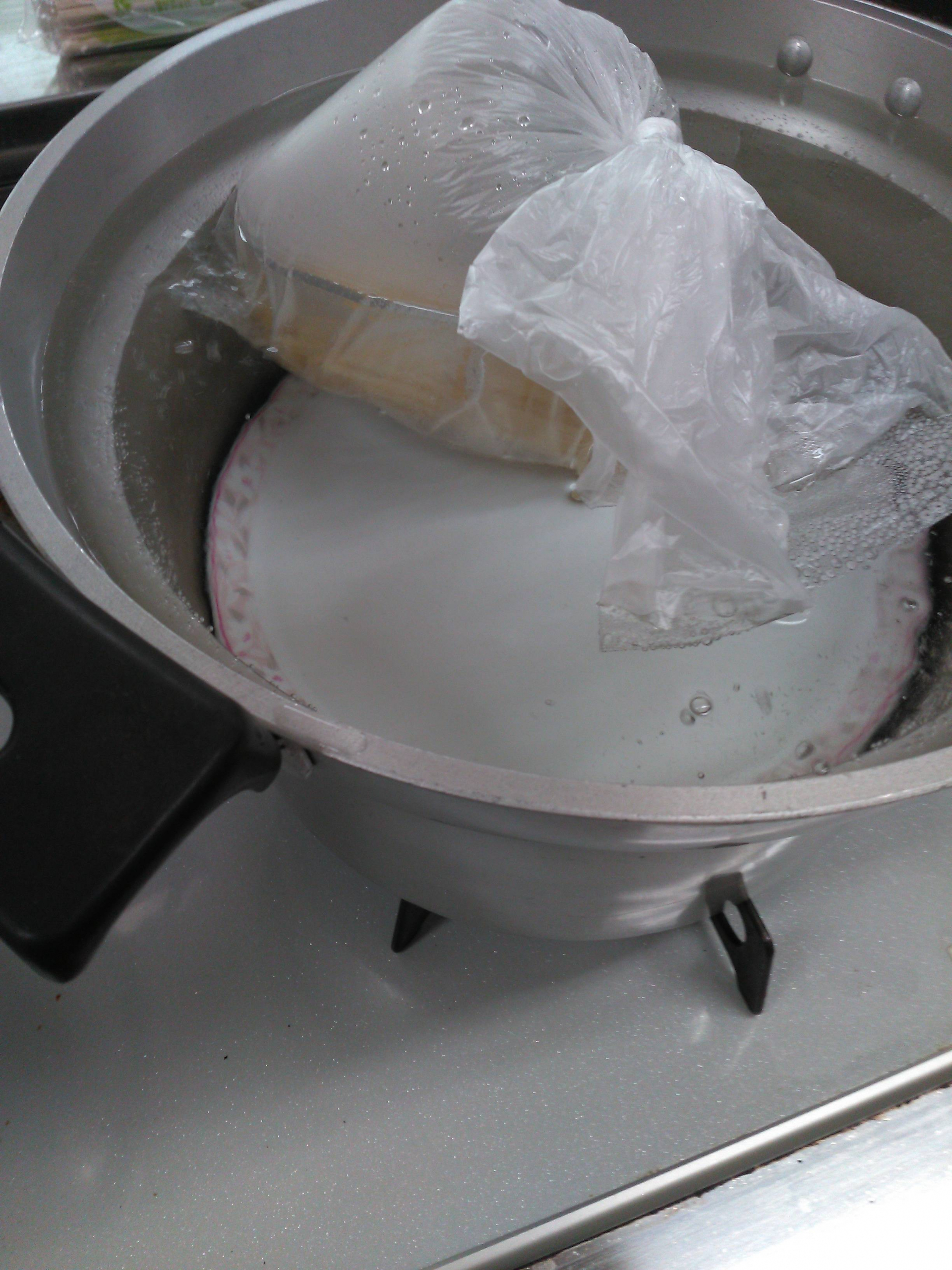 水を入れた鍋を用意して、耐熱用の袋に、お米と水、パスタと水、餅をそれぞれ入れて、鍋の中に入れて湯煎をします。