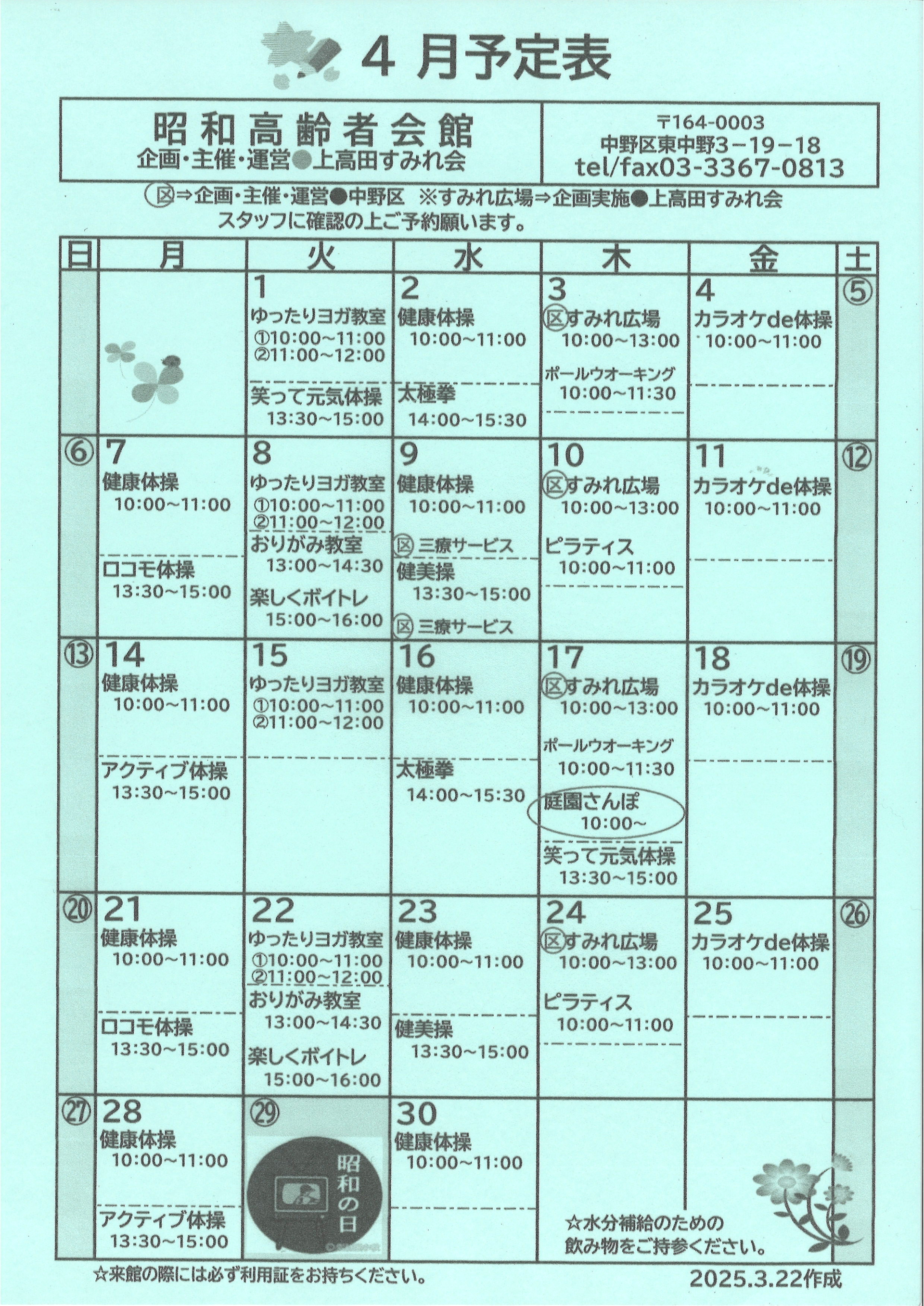 【中野包括】昭和高齢者会館R7.4月のスケジュール