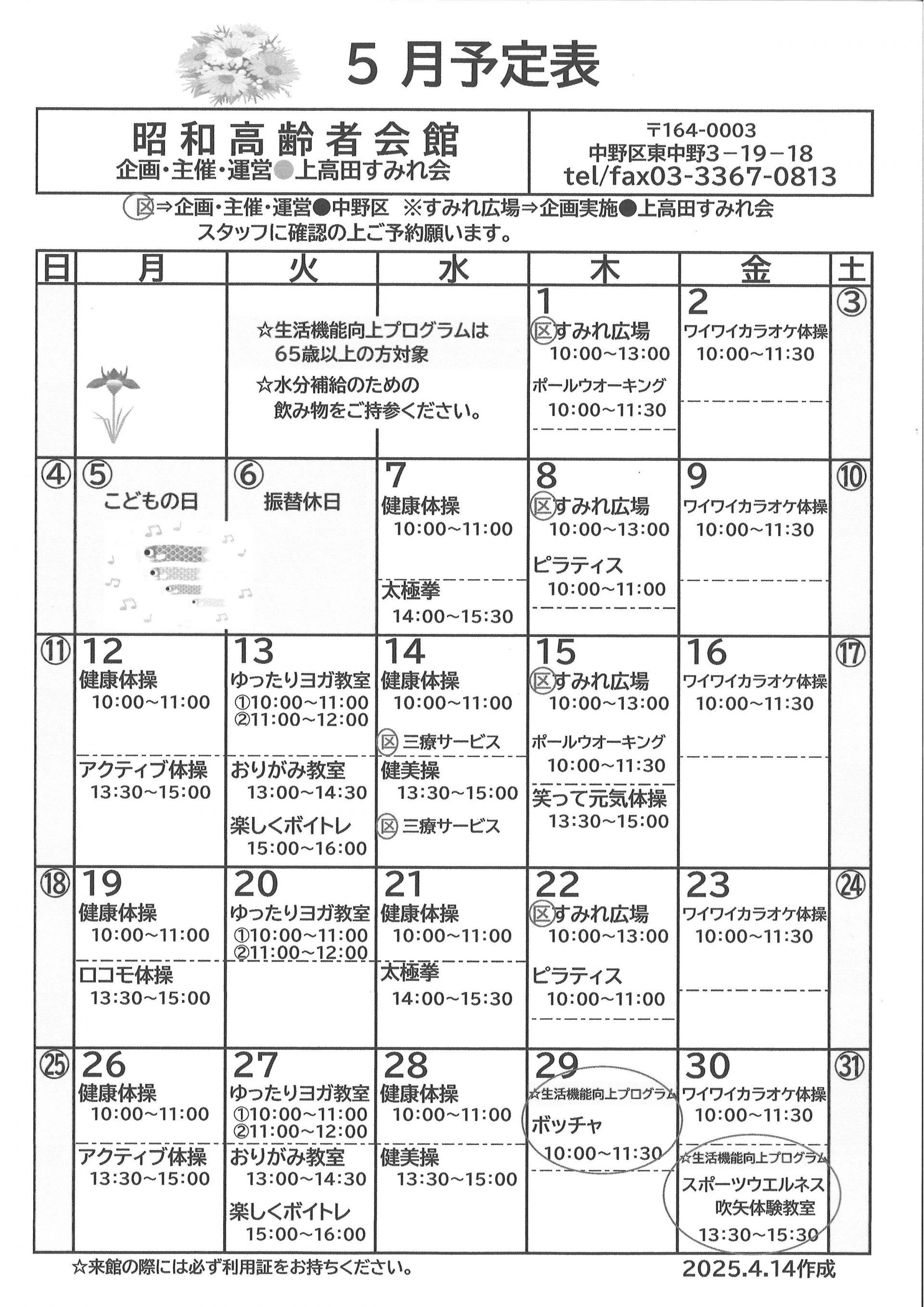 【中野包括】R7.5月昭和高齢者会館スケジュール