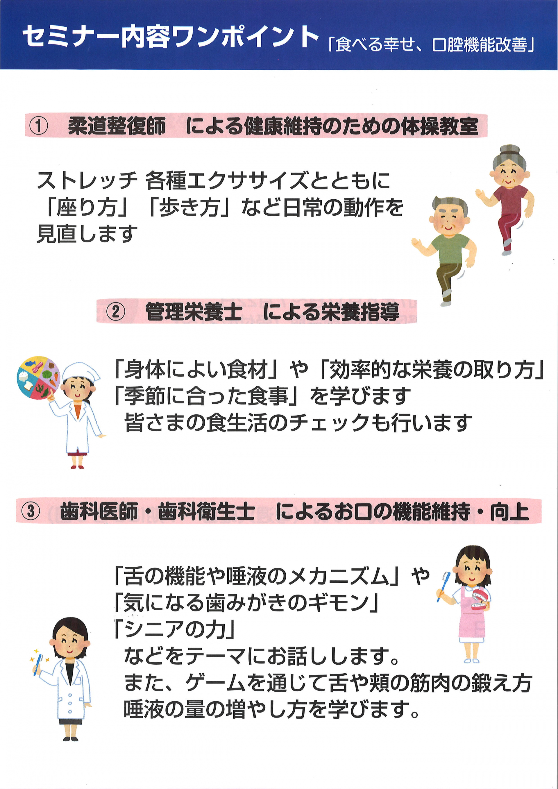 柔道整復師による体操教室があったり、栄養士による栄養指導、歯科医師・歯科衛生士によるお口の機能向上のための講話があったりと