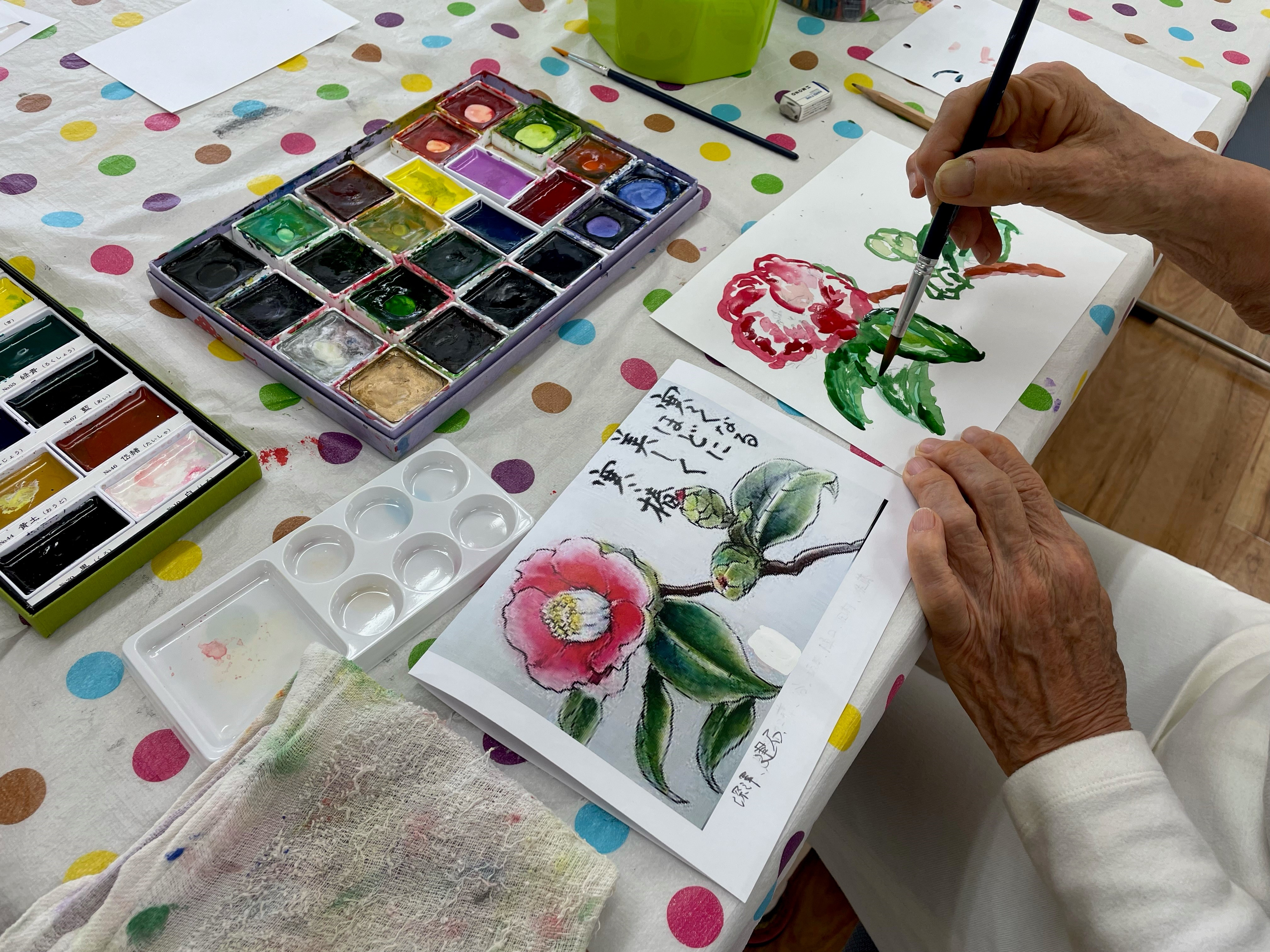 紙粘土を使って干支の置物(今年は辰)を作っているグループと、絵を描いているグループに分かれて作業をされていました。描き終わった絵は来月のカレンダーとしてご本人たちの手元に戻っていました。