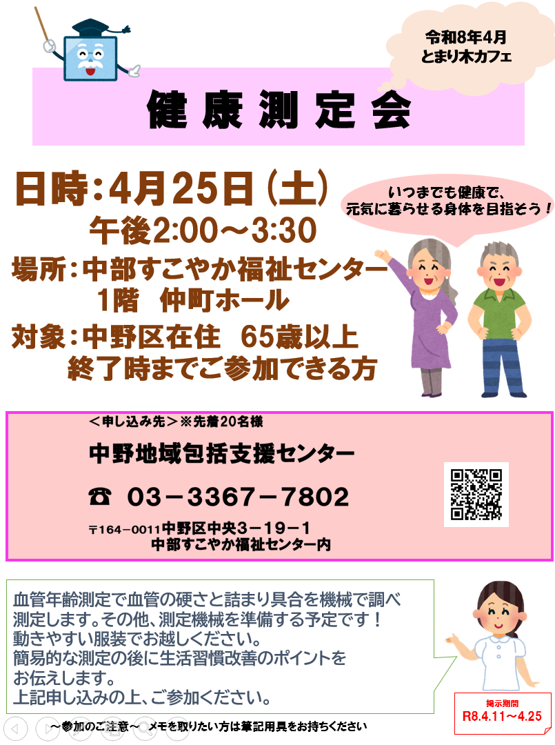 新年度初のとまり木カフェは健康測定会を実施します。