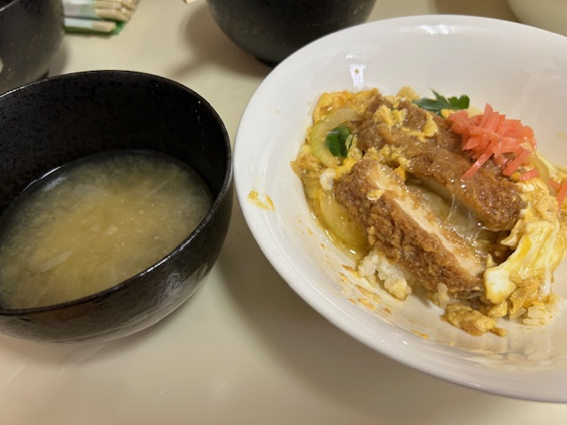 本日のメニューはかつ丼とお味噌汁。